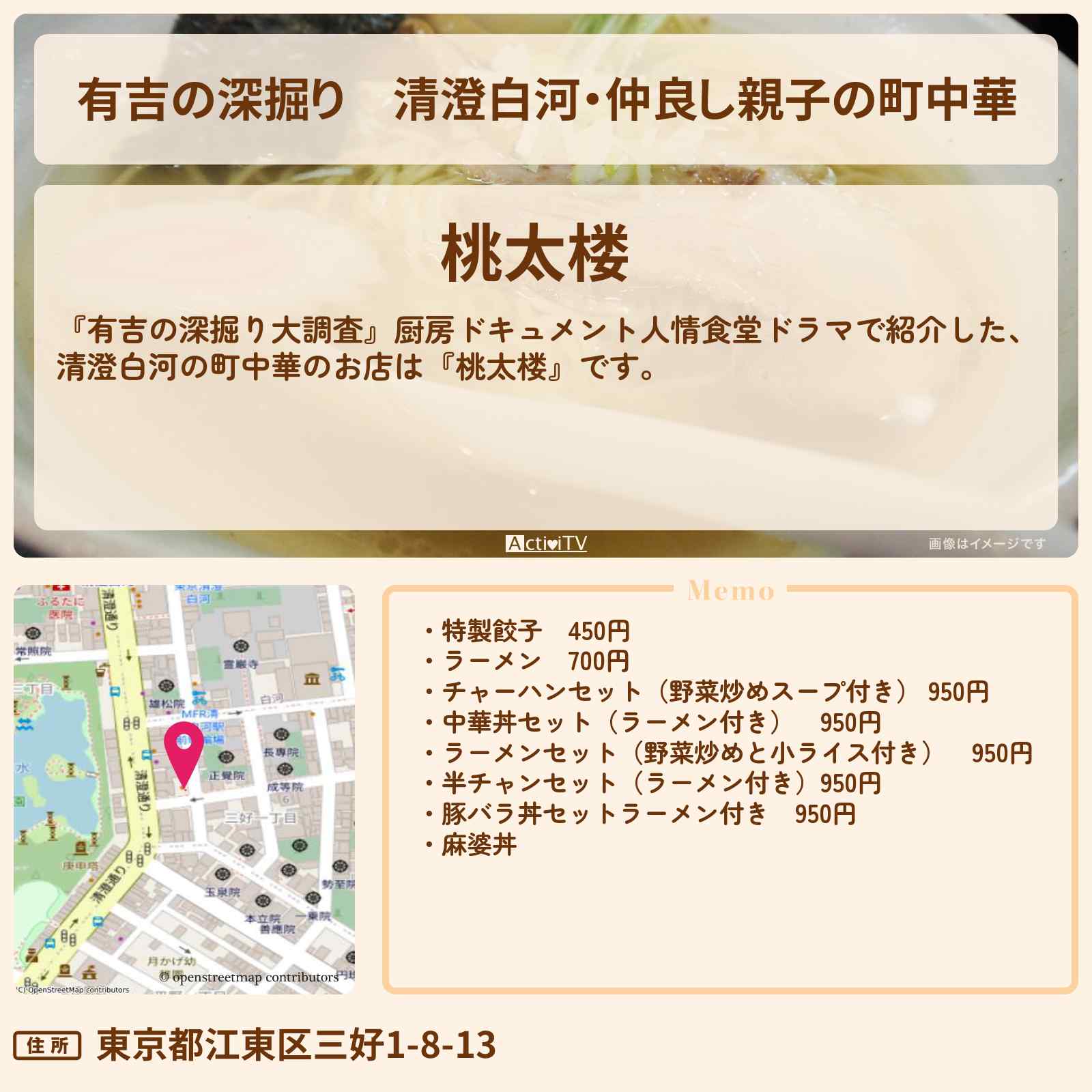 【有吉の深掘り】清澄白河・仲良し親子の町中華『桃太楼』人情食堂ドラマのお店の場所