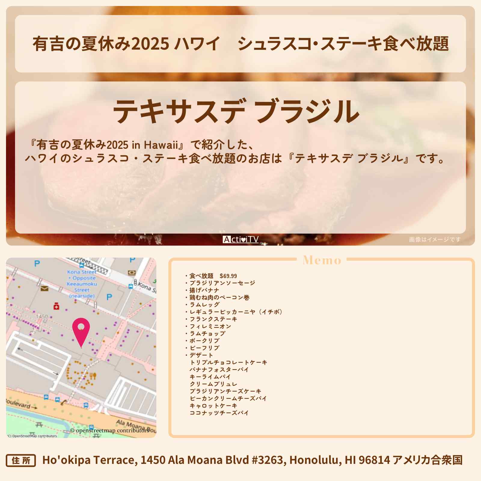 放送の【有吉の夏休み2025 in Hawaii】で紹介した、ハワイのシュラスコ・ステーキ食べ放題のお店は『テキサスデ ブラジル』です。