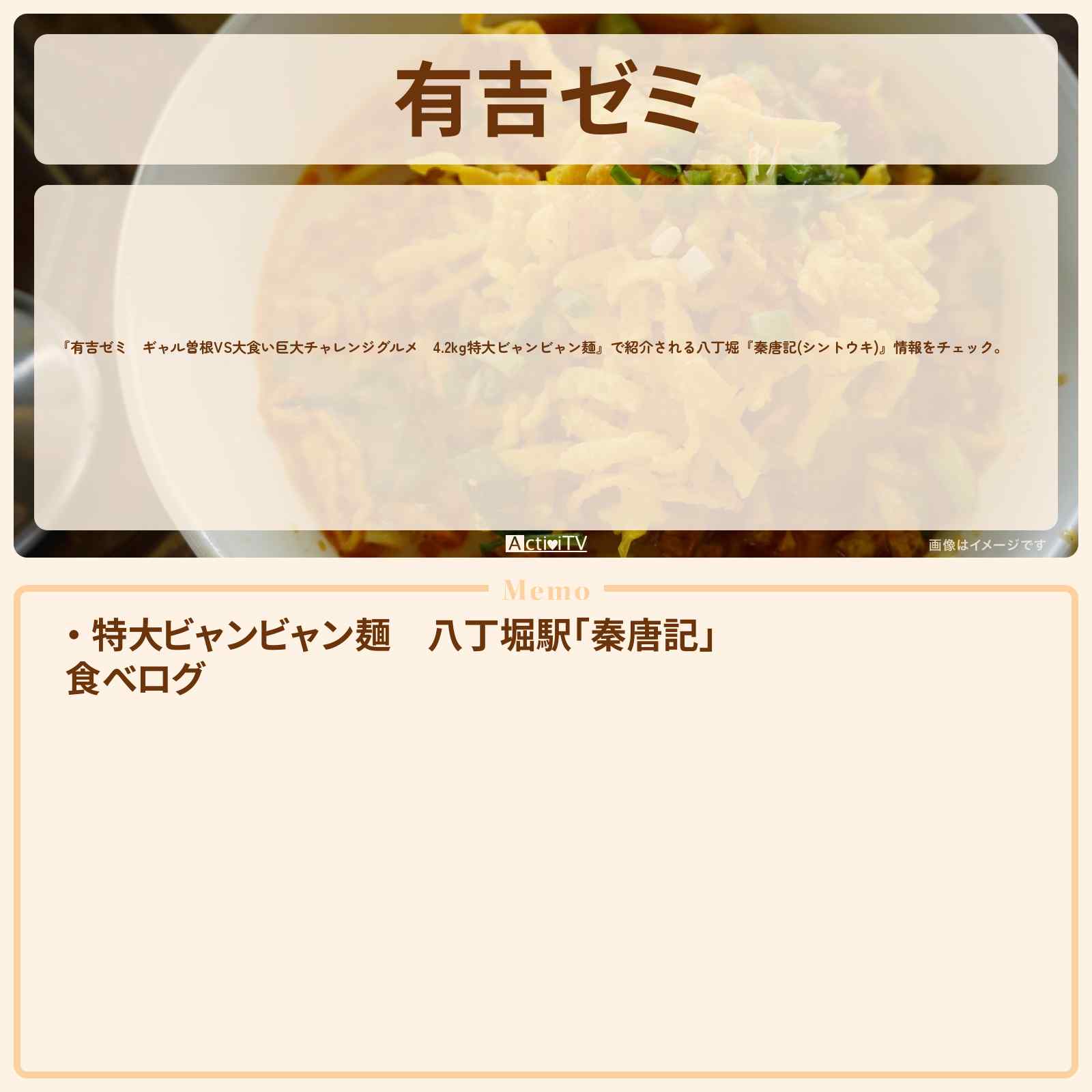 2019年9月16日(月)放送の【有吉ゼミ ギャル曽根VS大食い巨大チャレンジグルメ 4.2kg特大ビャンビャン麺】で紹介される八丁堀『秦唐記(シントウキ)』情報をチェック。
