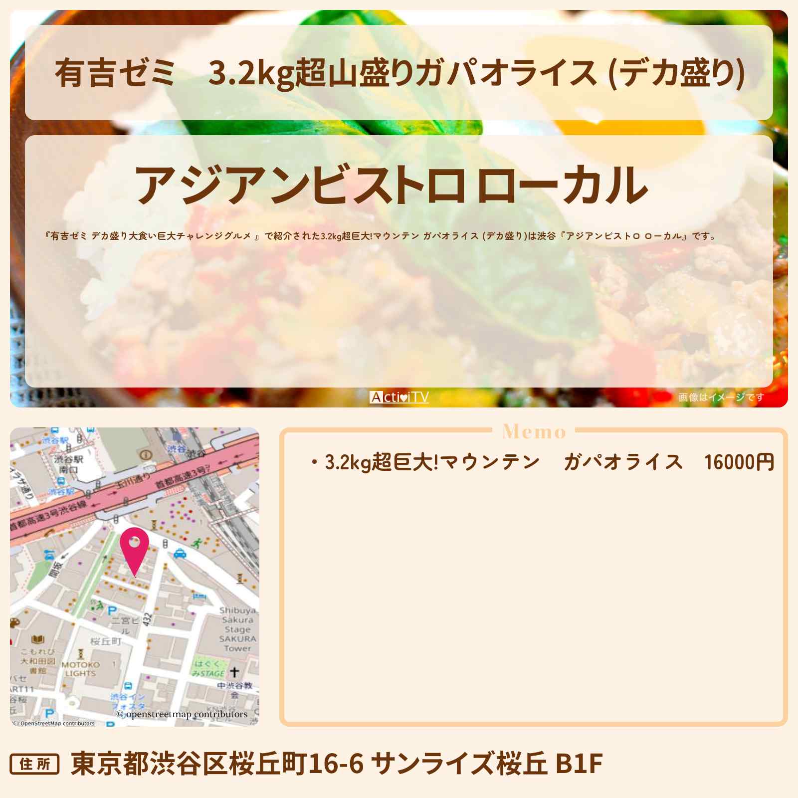 放送の【有吉ゼミ デカ盛り大食い巨大チャレンジグルメ 】で紹介された3.2kg超巨大!マウンテン ガパオライス (デカ盛り)は渋谷『アジアンビストロ ローカル』です。