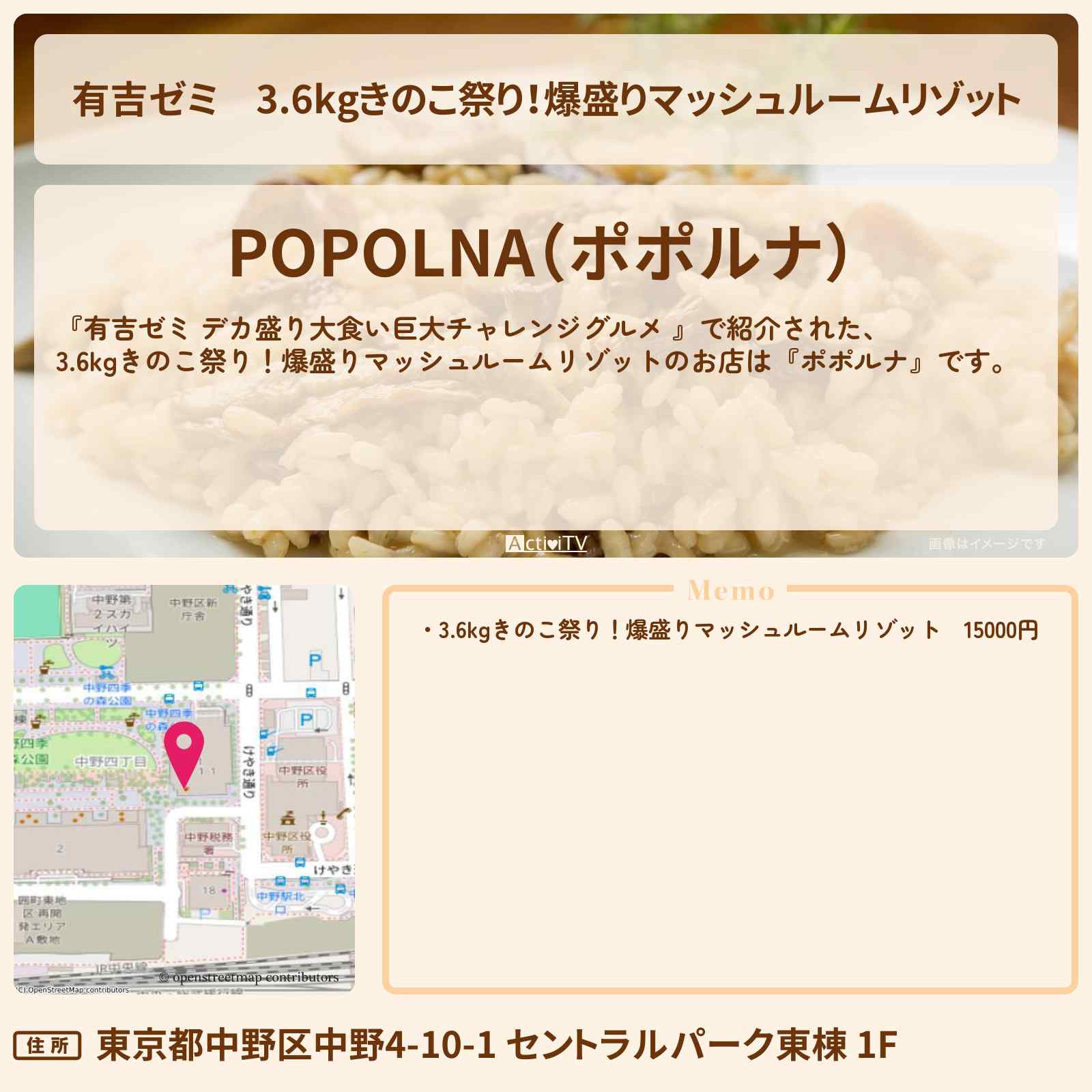 放送の【有吉ゼミ デカ盛り大食い巨大チャレンジグルメ 】で紹介された、3.6kgきのこ祭り!爆盛りマッシュルームリゾットのお店は『ポポルナ』です。