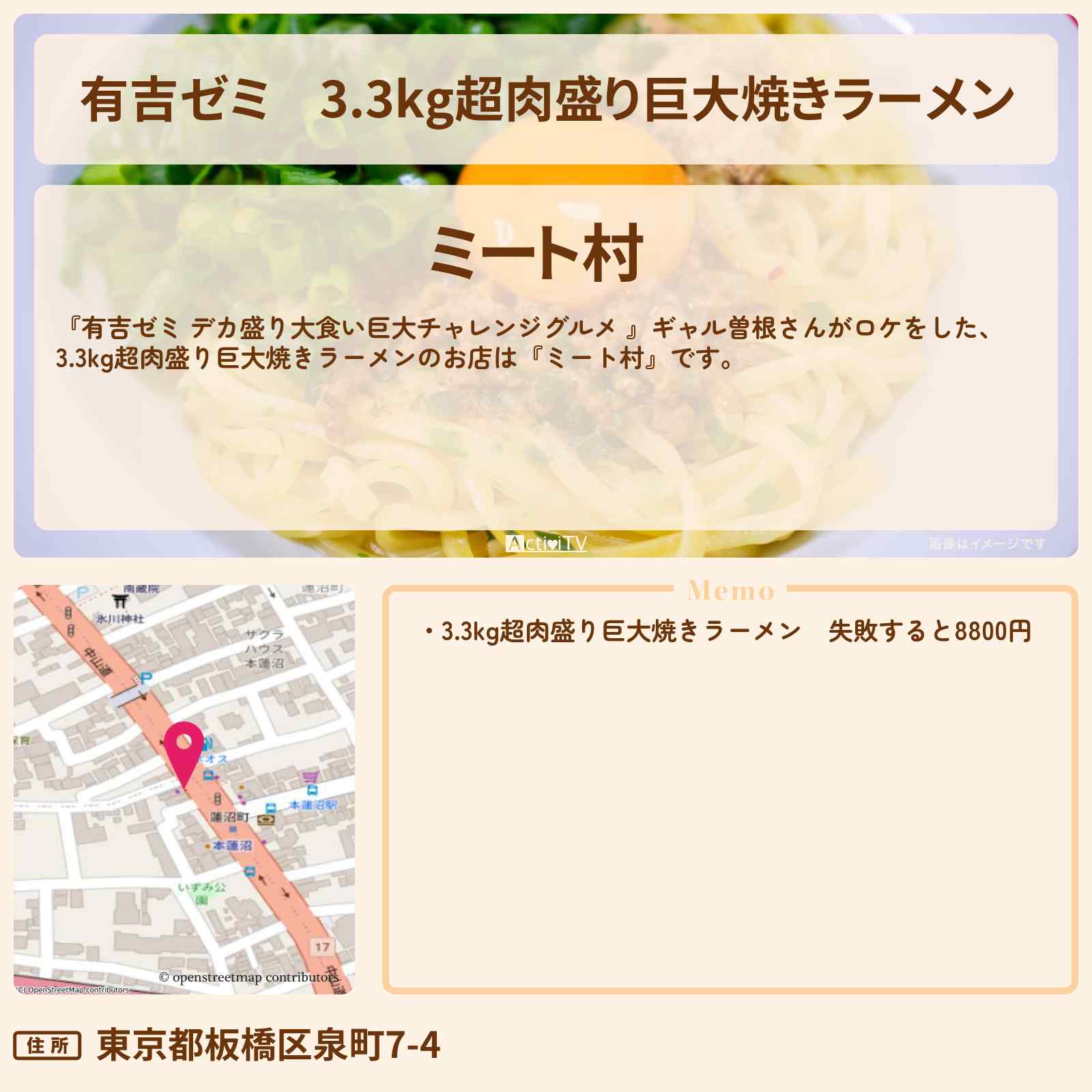 放送の【有吉ゼミ デカ盛り大食い巨大チャレンジグルメ 】ギャル曽根さんがロケをした、3.3kg超肉盛り巨大焼きラーメンのお店は『ミート村』です。