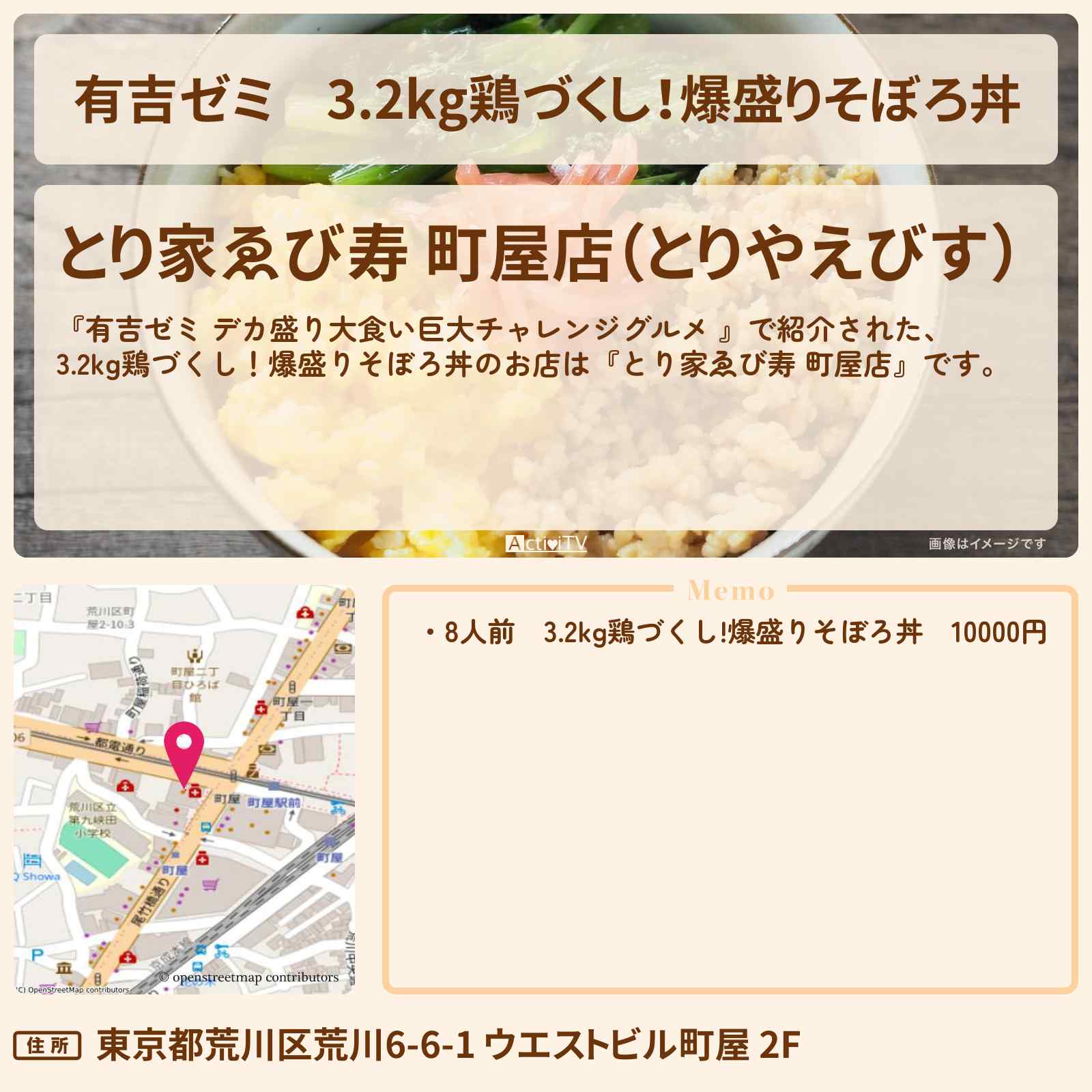 放送の【有吉ゼミ デカ盛り大食い巨大チャレンジグルメ 】で紹介された、3.2kg鶏づくし!爆盛りそぼろ丼のお店は『とり家ゑび寿 町屋店』です。