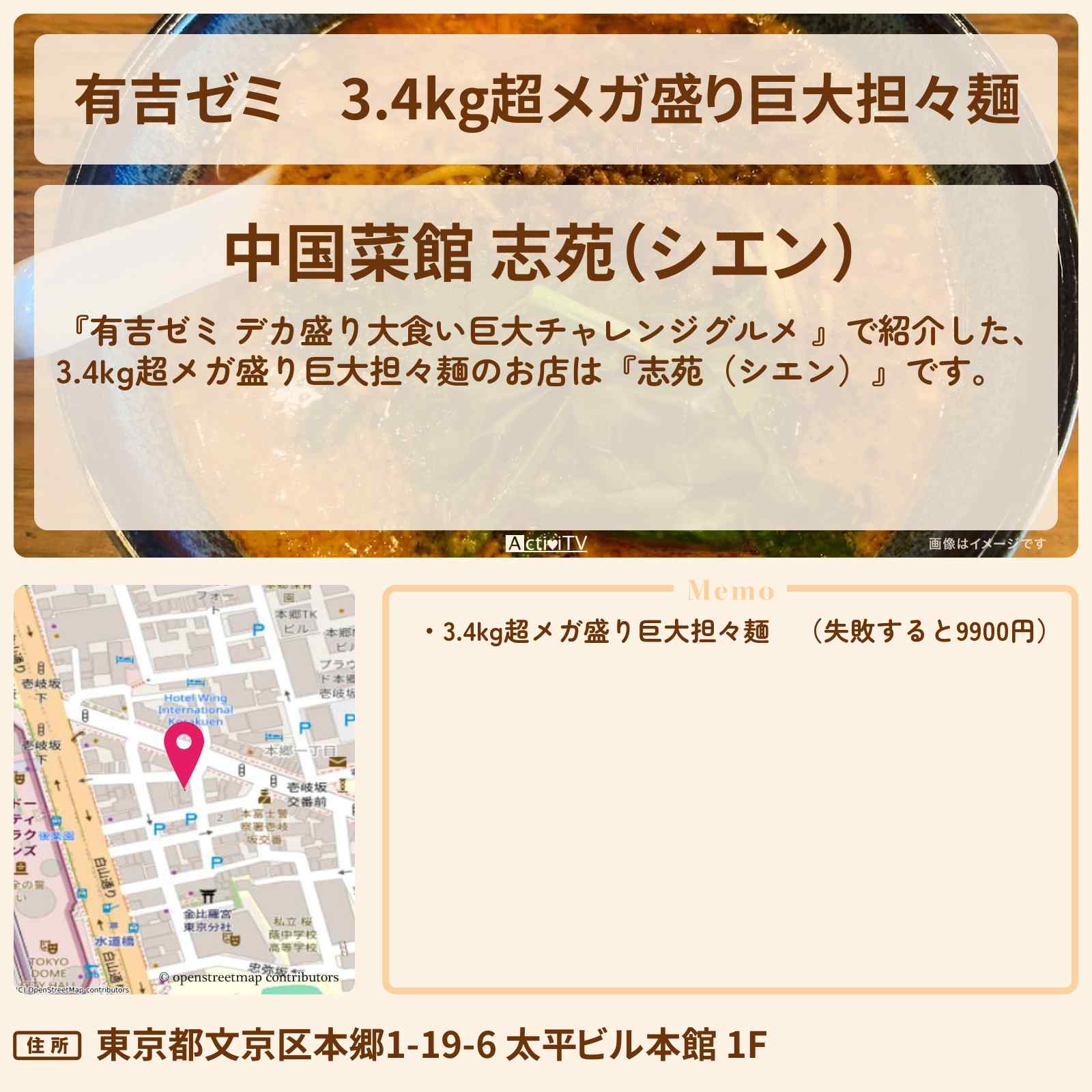 放送の【有吉ゼミ デカ盛り大食い巨大チャレンジグルメ 】で紹介した、3.4kg超メガ盛り巨大担々麺のお店は『志苑(シエン)』です。