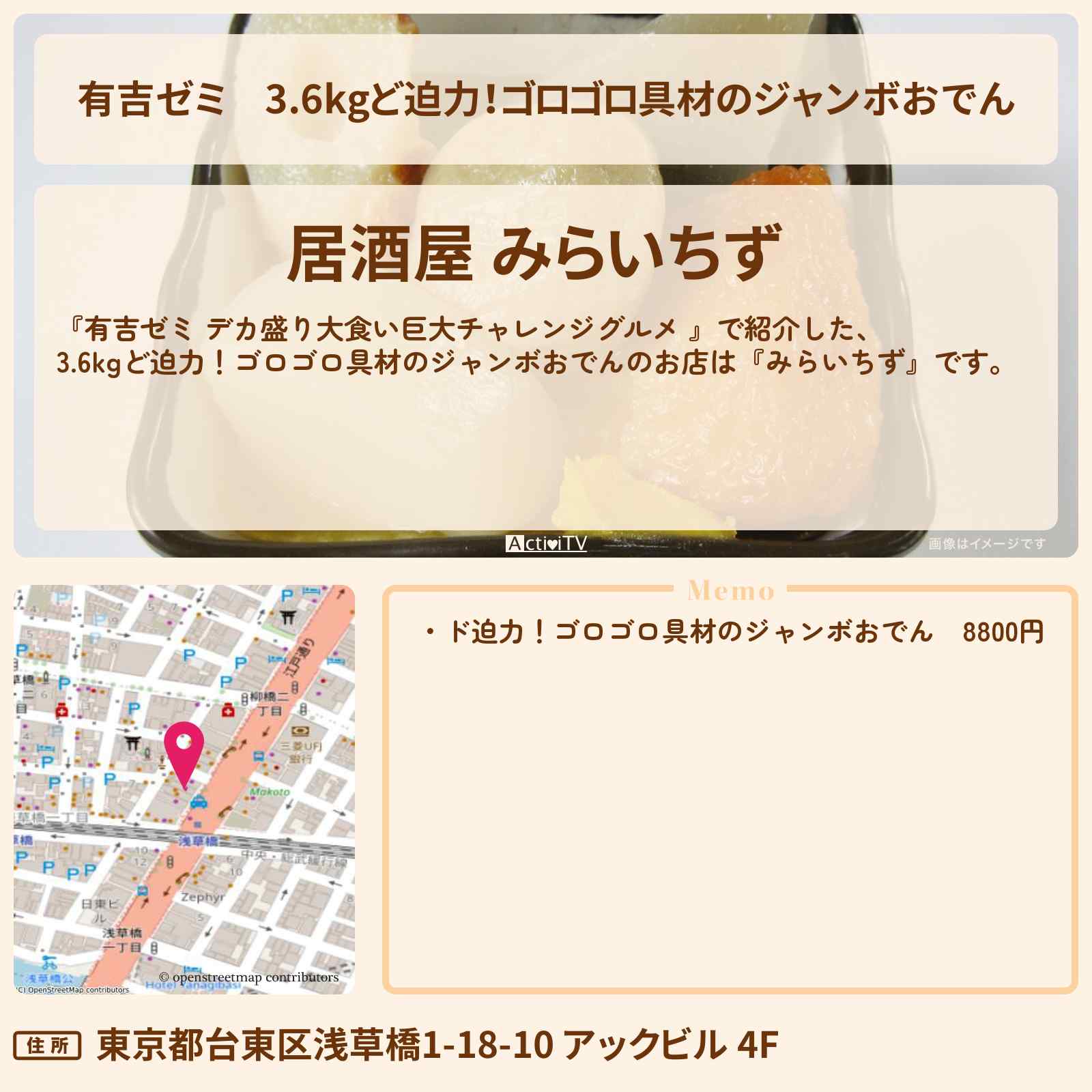 3.6kgど迫力!ゴロゴロ具材のジャンボおでん 浅草橋駅「居酒屋 みらいちず」