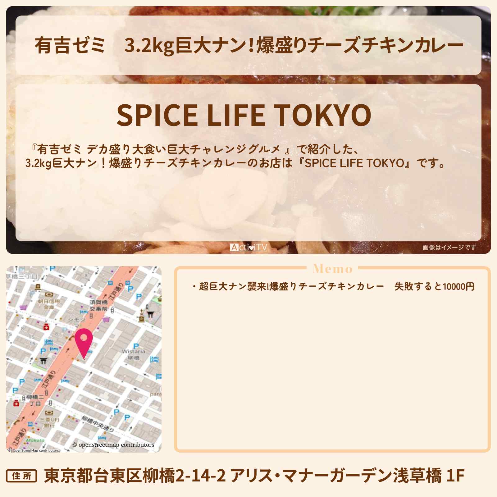 【有吉ゼミ】3.2kg巨大ナン!爆盛りチーズチキンカレー『SPICE LIFE TOKYO』浅草橋のお店の場所「ギャル曽根 vs チャレンジグルメ」2025/9/1放送