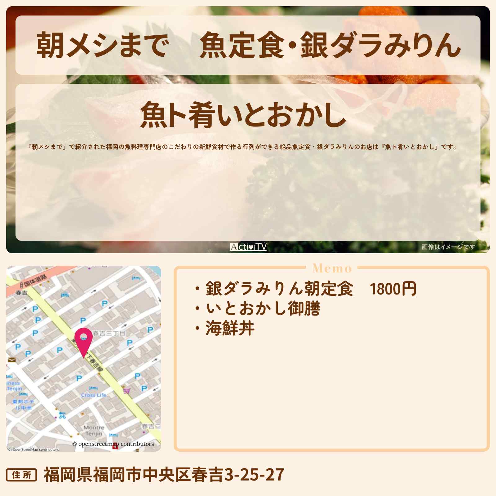 放送の【朝メシまで】で紹介された福岡の魚料理専門店のこだわりの新鮮食材で作る行列ができる絶品魚定食・銀ダラみりんのお店は『魚ト肴いとおかし』です。
