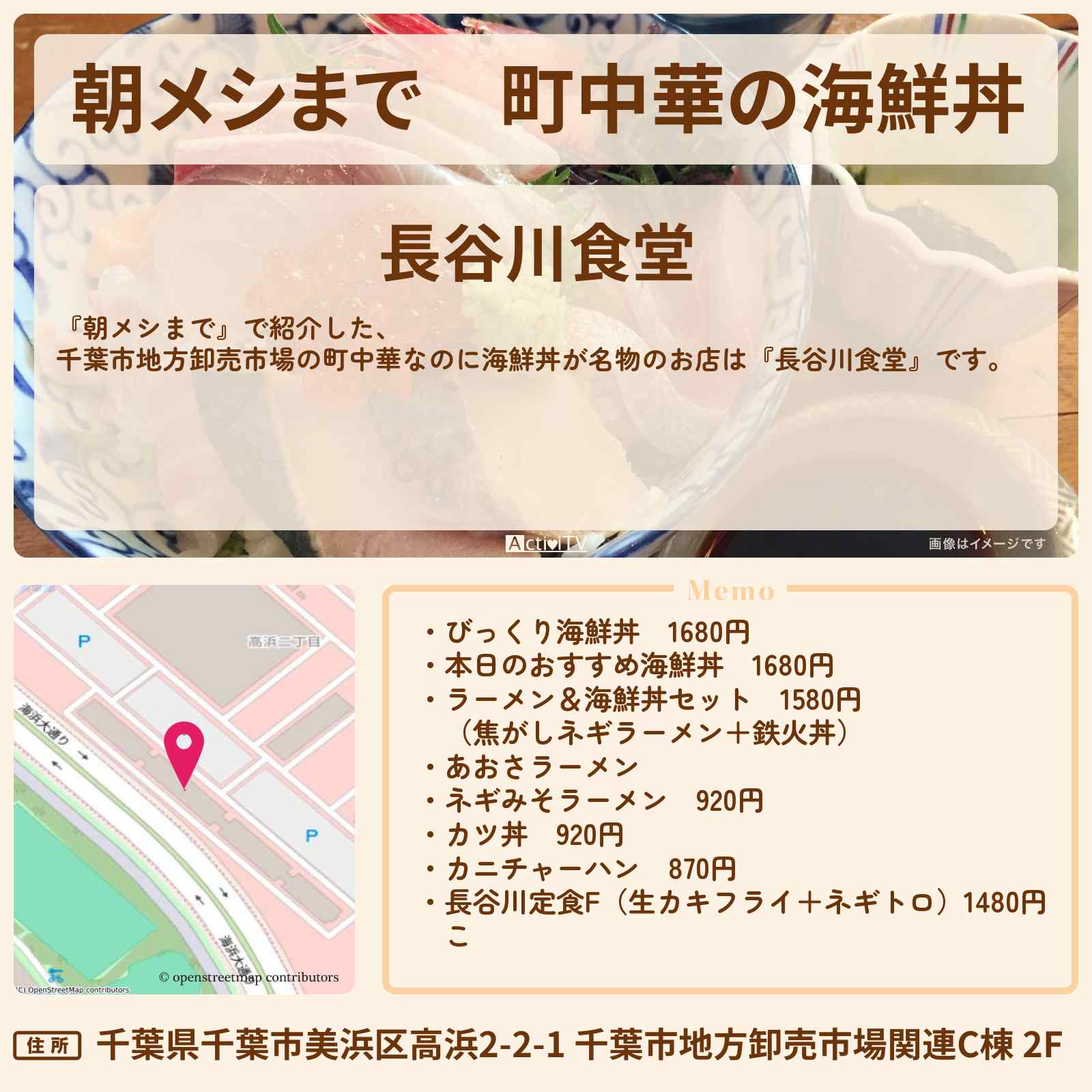 放送の【朝メシまで】で紹介した、千葉市地方卸売市場の町中華なのに海鮮丼が名物のお店は『長谷川食堂』です。