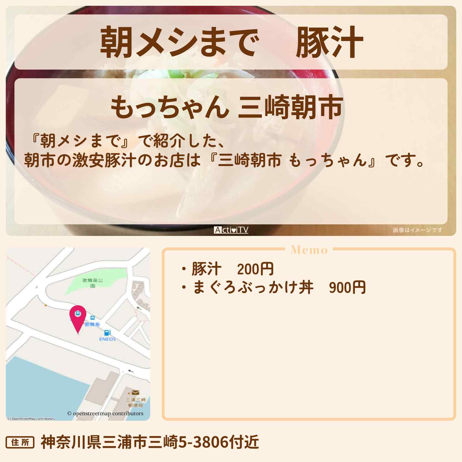 放送の【朝メシまで】で紹介した、朝市の激安豚汁のお店は『三崎朝市 もっちゃん』です。