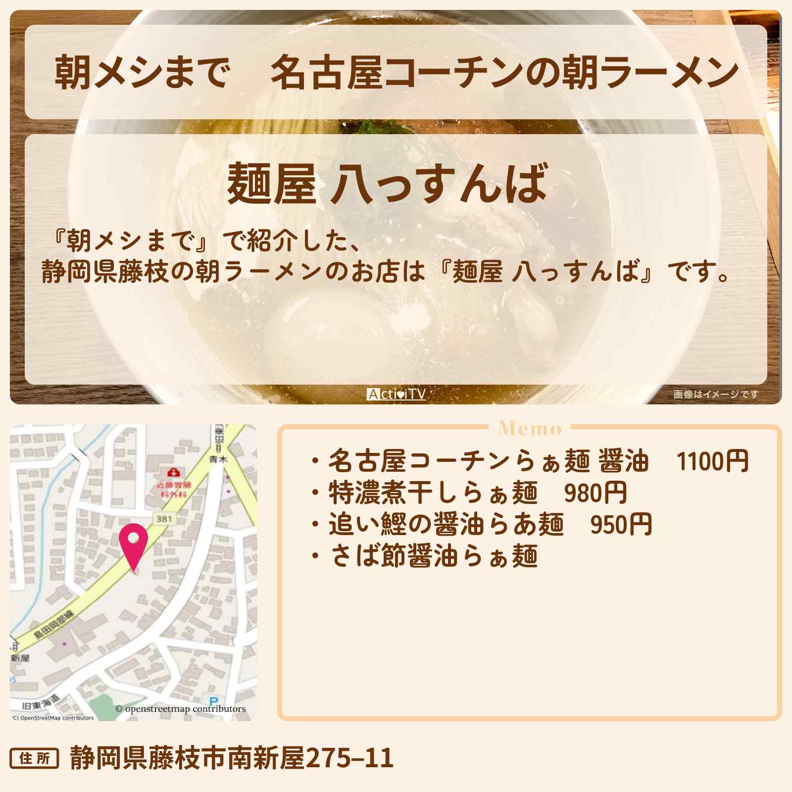 放送の【朝メシまで】で紹介した、静岡県藤枝の朝ラーメンのお店は『麺屋 八っすんば』です。