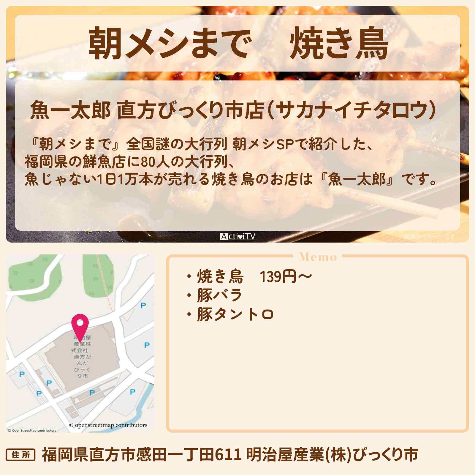 放送の【朝メシまで】全国謎の大行列 朝メシSPで紹介した、福岡県の鮮魚店に80人の大行列、魚じゃない1日1万本が売れる焼き鳥のお店は『魚一太郎』です。