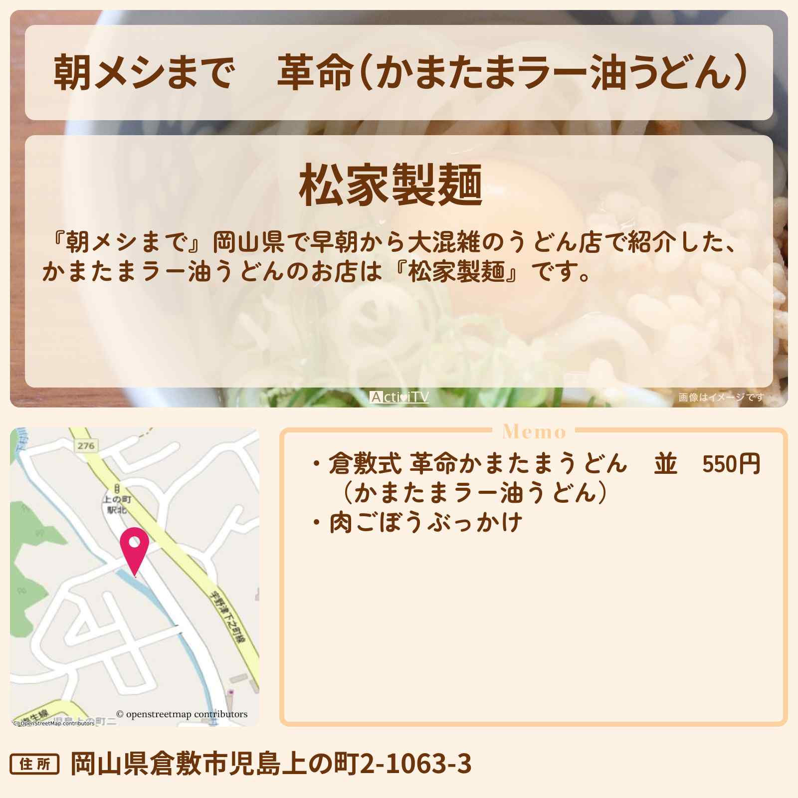 【松家製麺】は岡山県倉敷市の製麺所です。朝とお昼にはお店も営業しています。製麺所だからできる、創業以来変わらない製法の種類豊富な麺を様々なスタイルで味わってください。…