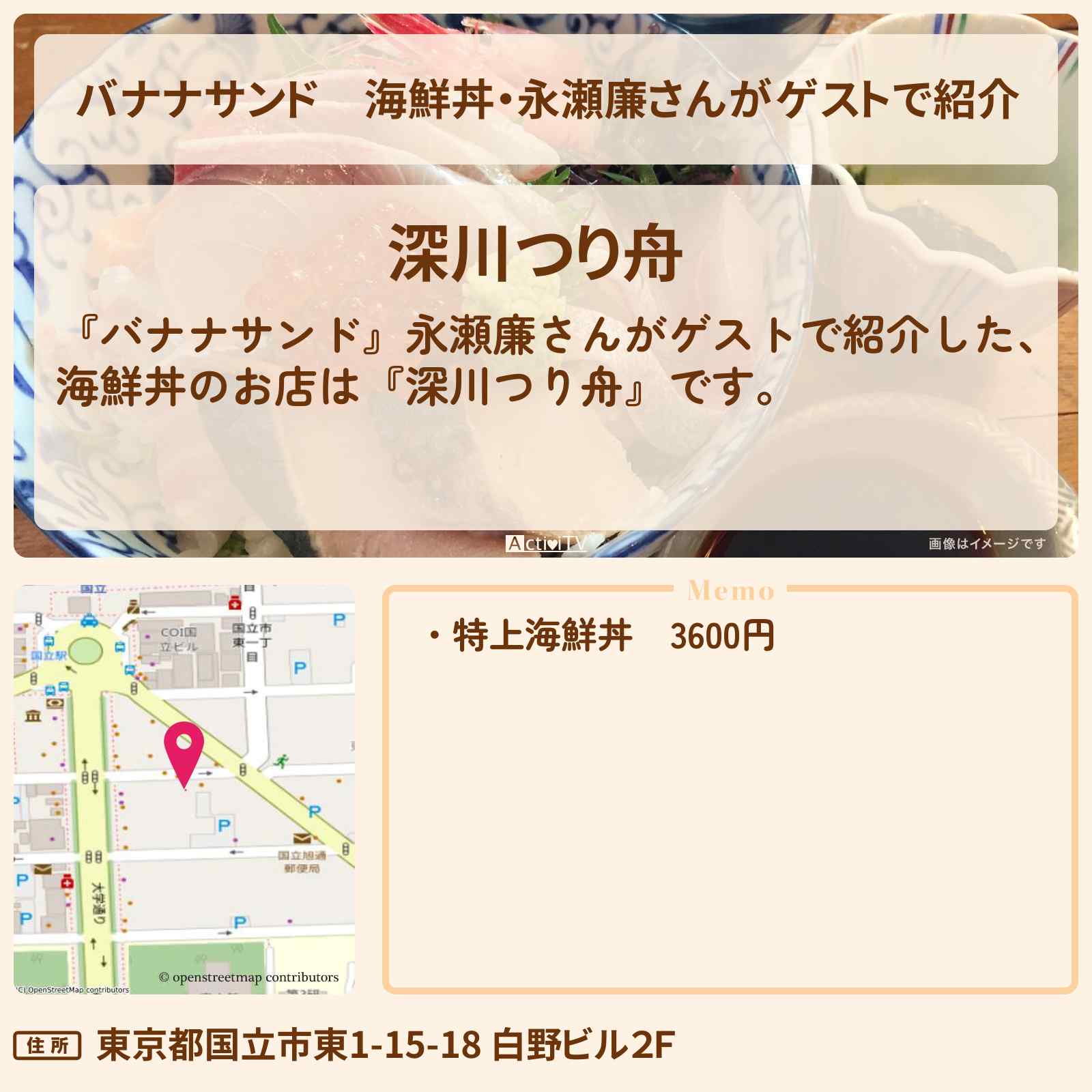 放送の【バナナサンド】永瀬廉さんがゲストで紹介した、海鮮丼のお店は『深川つり舟』です。