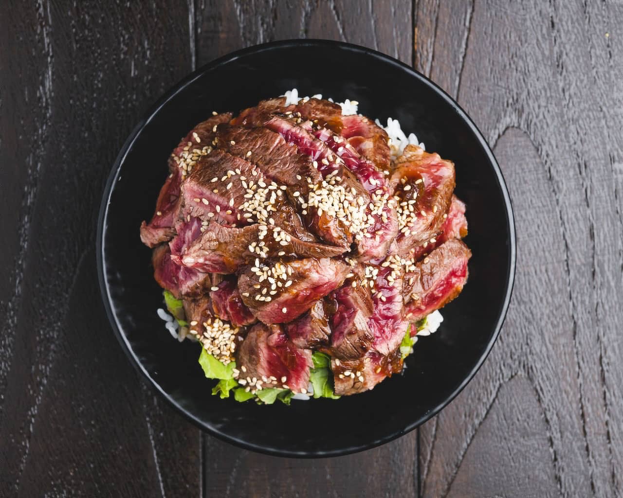 特製のステーキソースがかかった「ステーキ丼」のお肉は、ランプ肉・ロース肉からお肉を選ぶことができ、ランプステーキ丼は1,800円、ロースステーキ丼は2,200円で提供されています。