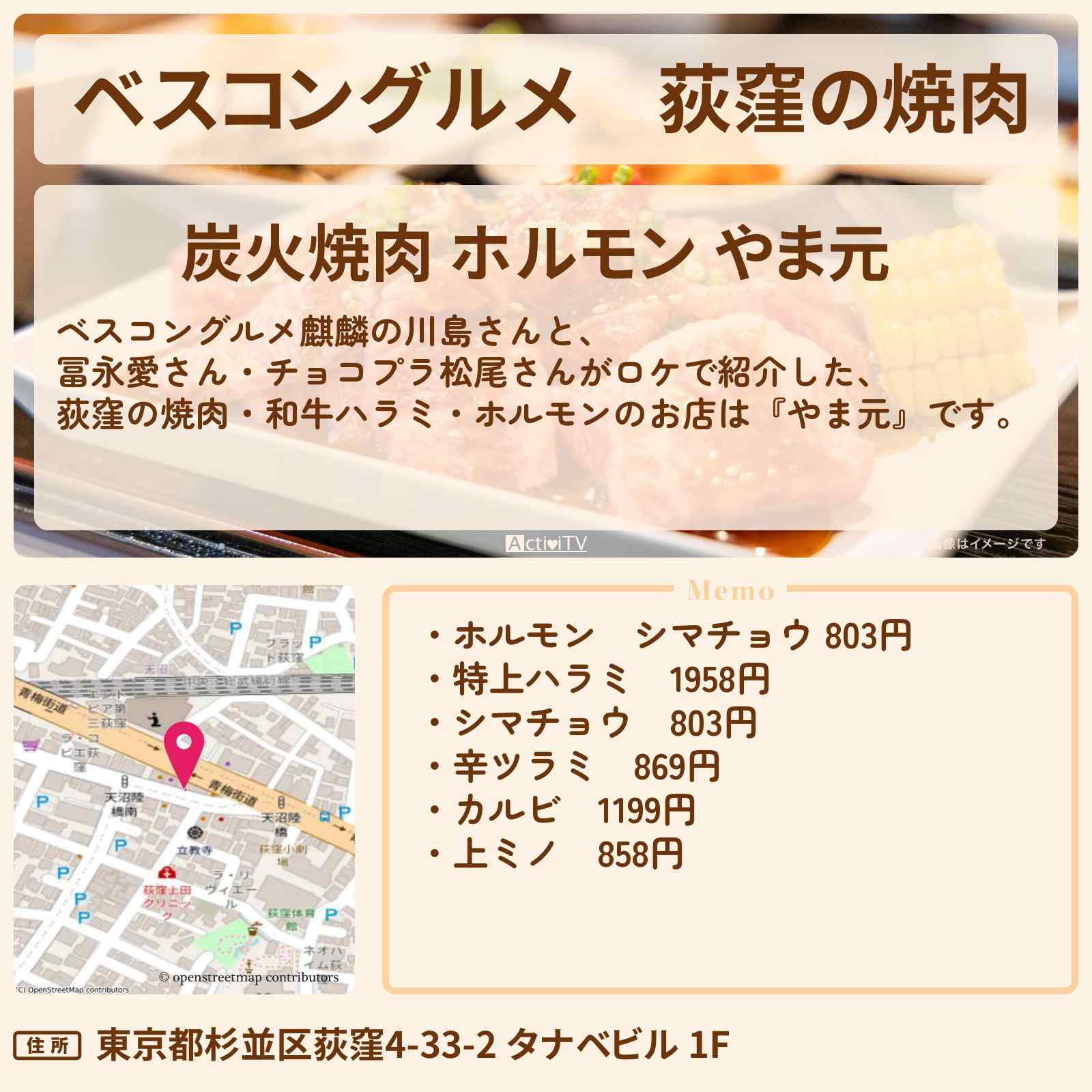 放送のベスコングルメ麒麟の川島さんと、冨永愛さん・チョコプラ松尾さんがロケで紹介した、荻窪の焼肉・和牛ハラミ・ホルモンのお店は『やま元』です。