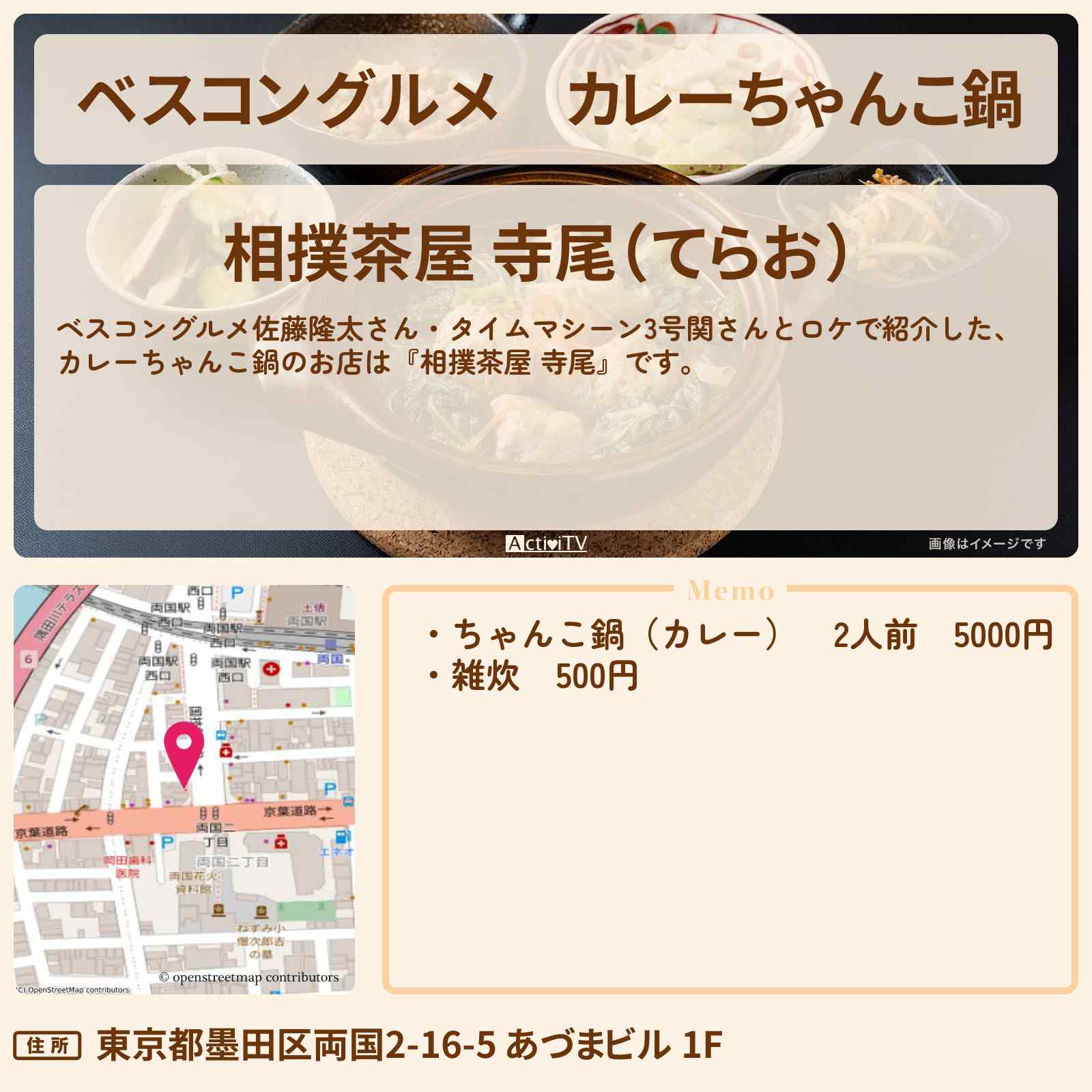 放送のベスコングルメ佐藤隆太さん・タイムマシーン3号関さんとロケで紹介した、カレーちゃんこ鍋のお店は『相撲茶屋 寺尾』です。
