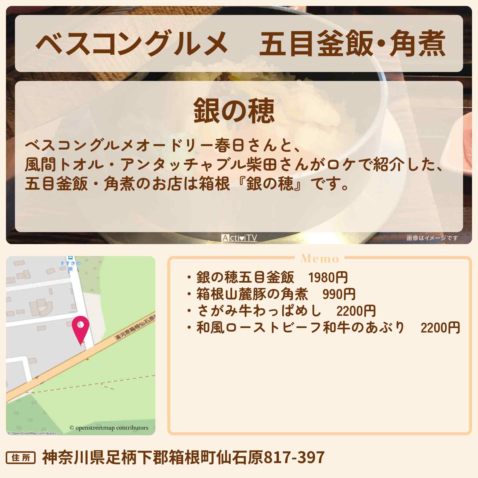 【ベスコングルメ】五目釜飯・角煮 箱根『銀の穂』ロケ地のお店〔風間トオル・アンタッチャブル柴田〕