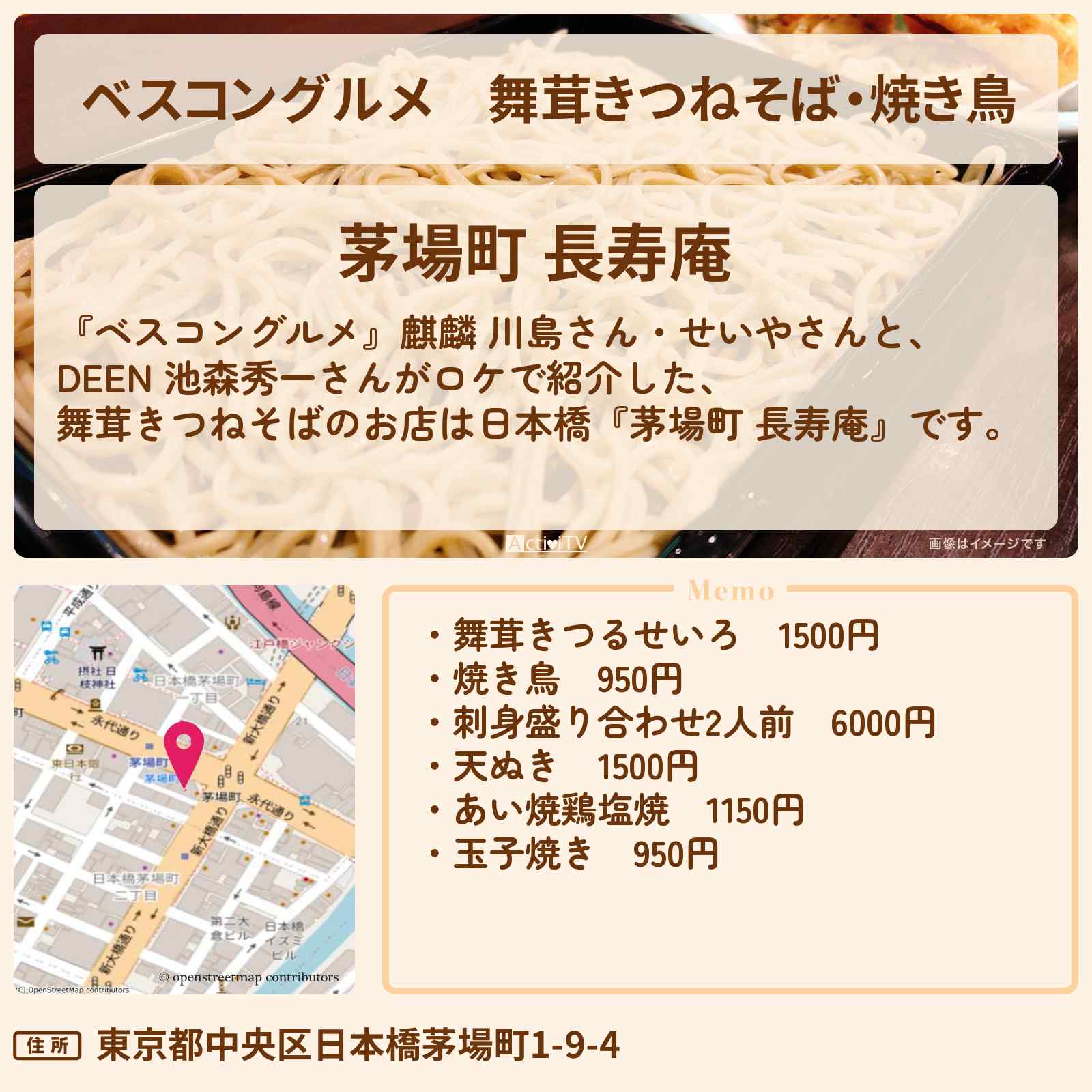 番組で紹介した舞茸きつねそばは、香り豊かな茨城県産の常陸秋そばを中心にブレンドし製麺した細切り二八そばを、風味を逃さぬよう風味を逃さめよう茹で時間は30秒に茹でてコシを残し、冷水でサッと締める香り高い細切りの二八蕎麦です。