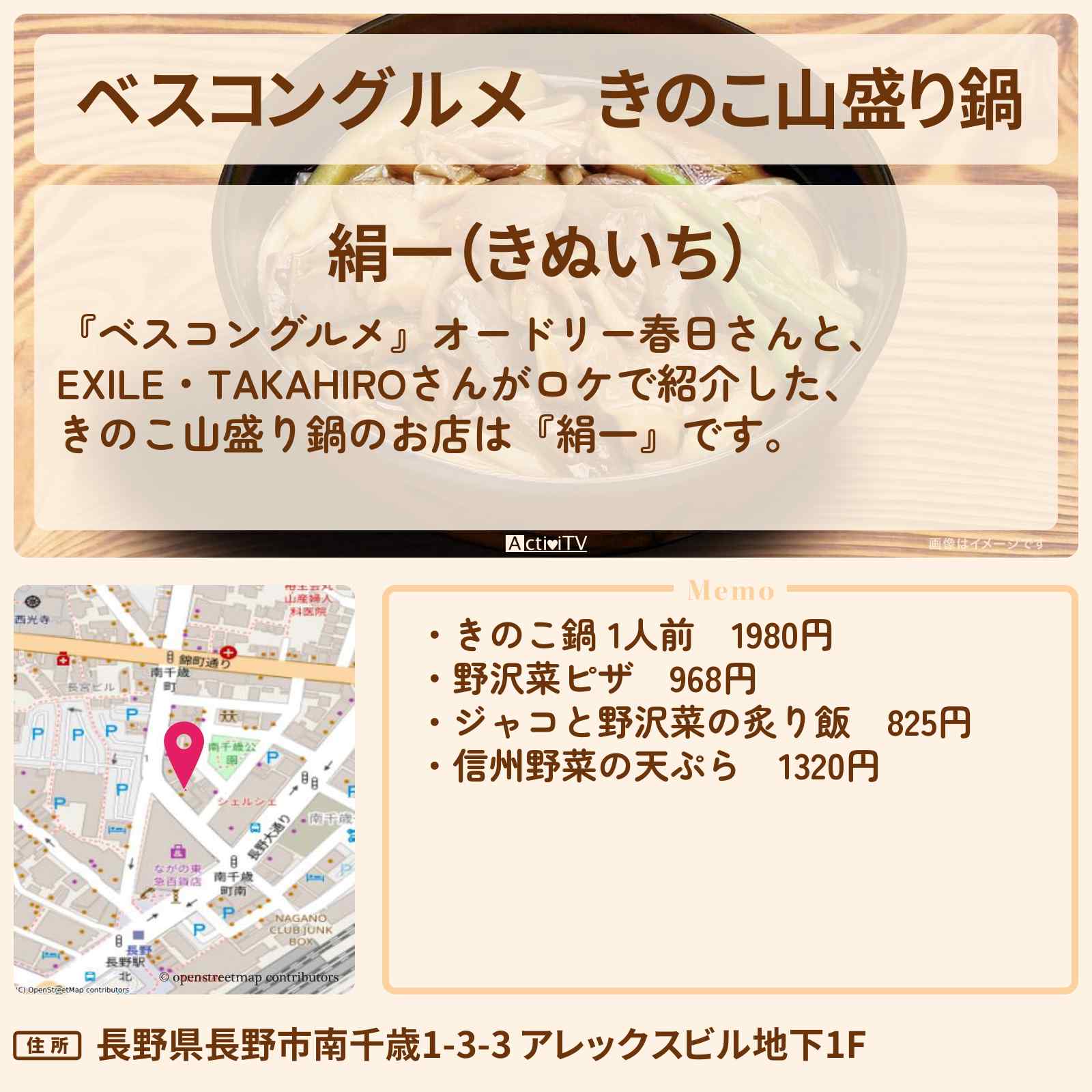 番組で紹介したきのこ鍋使用するのは店主自ら長野の山奥で収穫した今が旬の長野さんきのこ11種(アミタケ・ハナイグチ・原木なめこ・黒あわび茸・いっぽんかんこう・霜降りひらたけ・黒舞茸・ナラタケ・クロカワ・ブラウンえのき・クリフウセンタケ)を地元産の野菜や豚バラ肉の上に乗せて鍋一面をきのこで覆い尽くします。そこへ 特製のカツオ出汁を加え煮込んだら11種の旨味がスープに溶け込んだ、きのこの名産地の長野だからこそ味わえる極上の鍋に仕上がります。