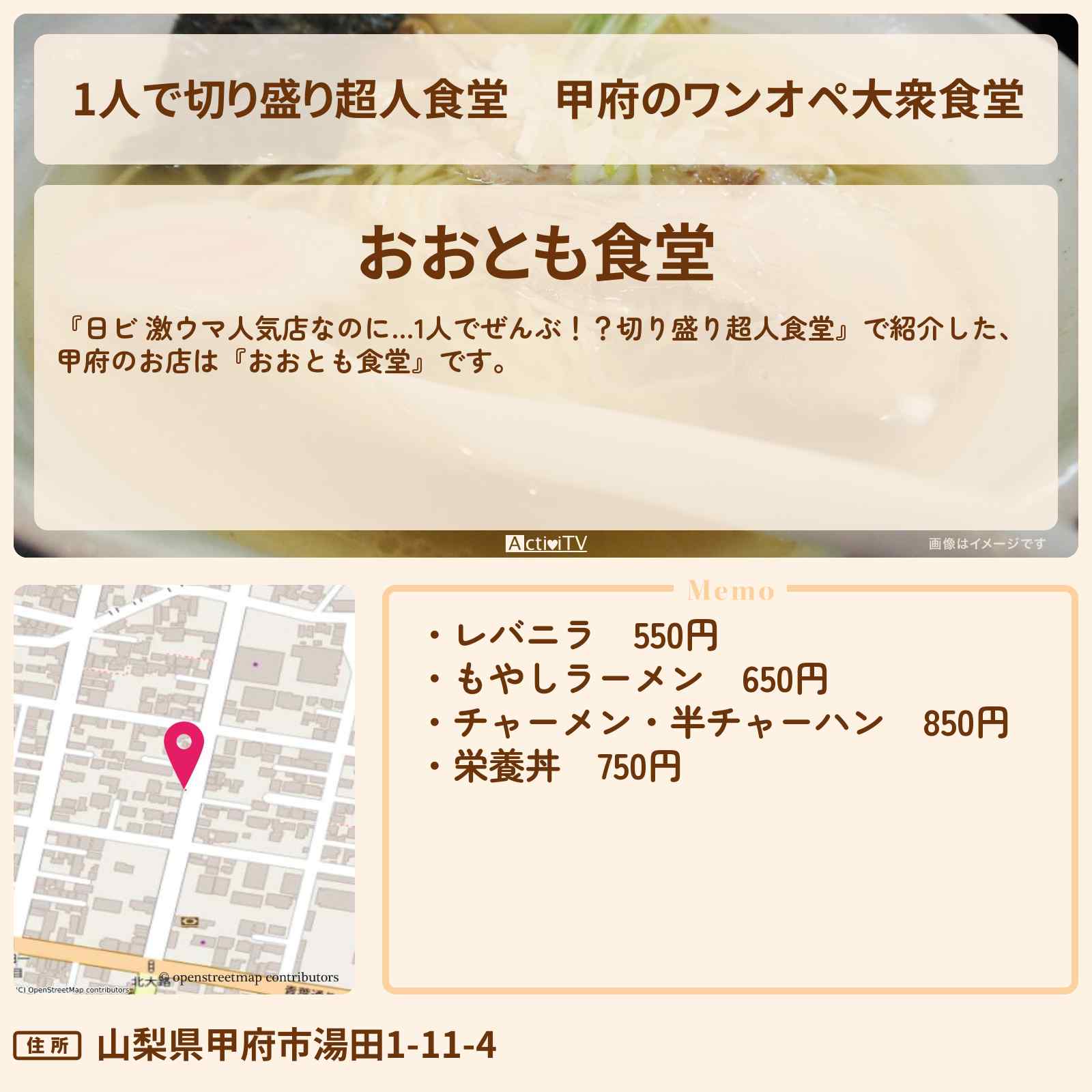 放送の【日ビ 激ウマ人気店なのに…1人でぜんぶ!?切り盛り超人食堂】で紹介した、甲府のお店は『おおとも食堂』です。