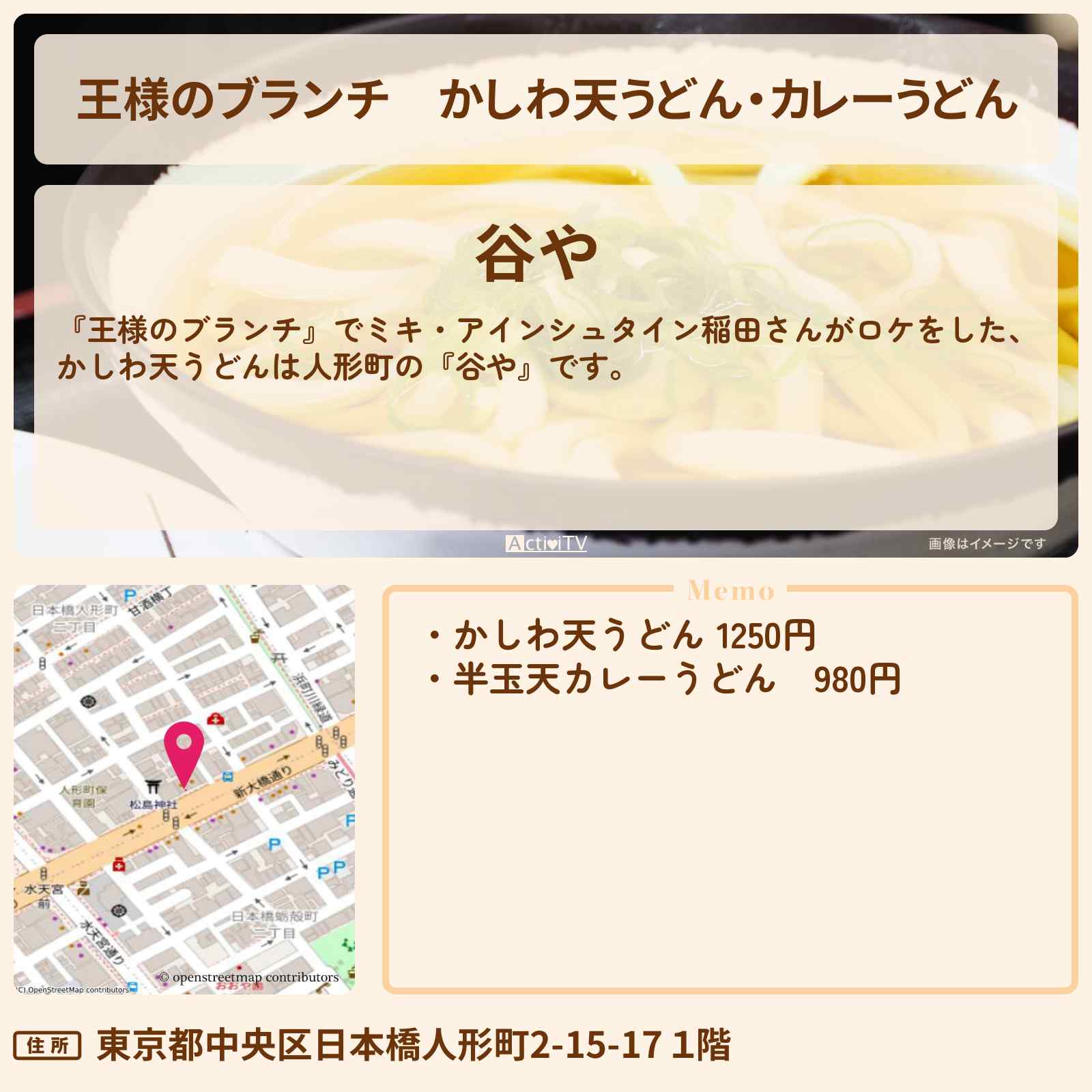 放送の【王様のブランチ】でミキ・アインシュタイン稲田さんがロケをした、かしわ天うどんは人形町の『谷や』です。