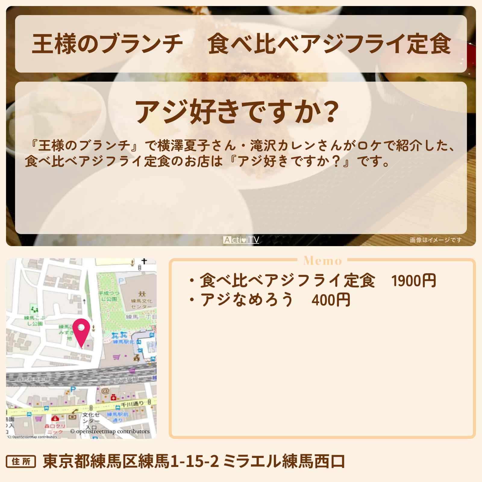 放送の【王様のブランチ】で横澤夏子さん・滝沢カレンさんがロケで紹介した、食べ比べアジフライ定食のお店は『アジ好きですか?』です。