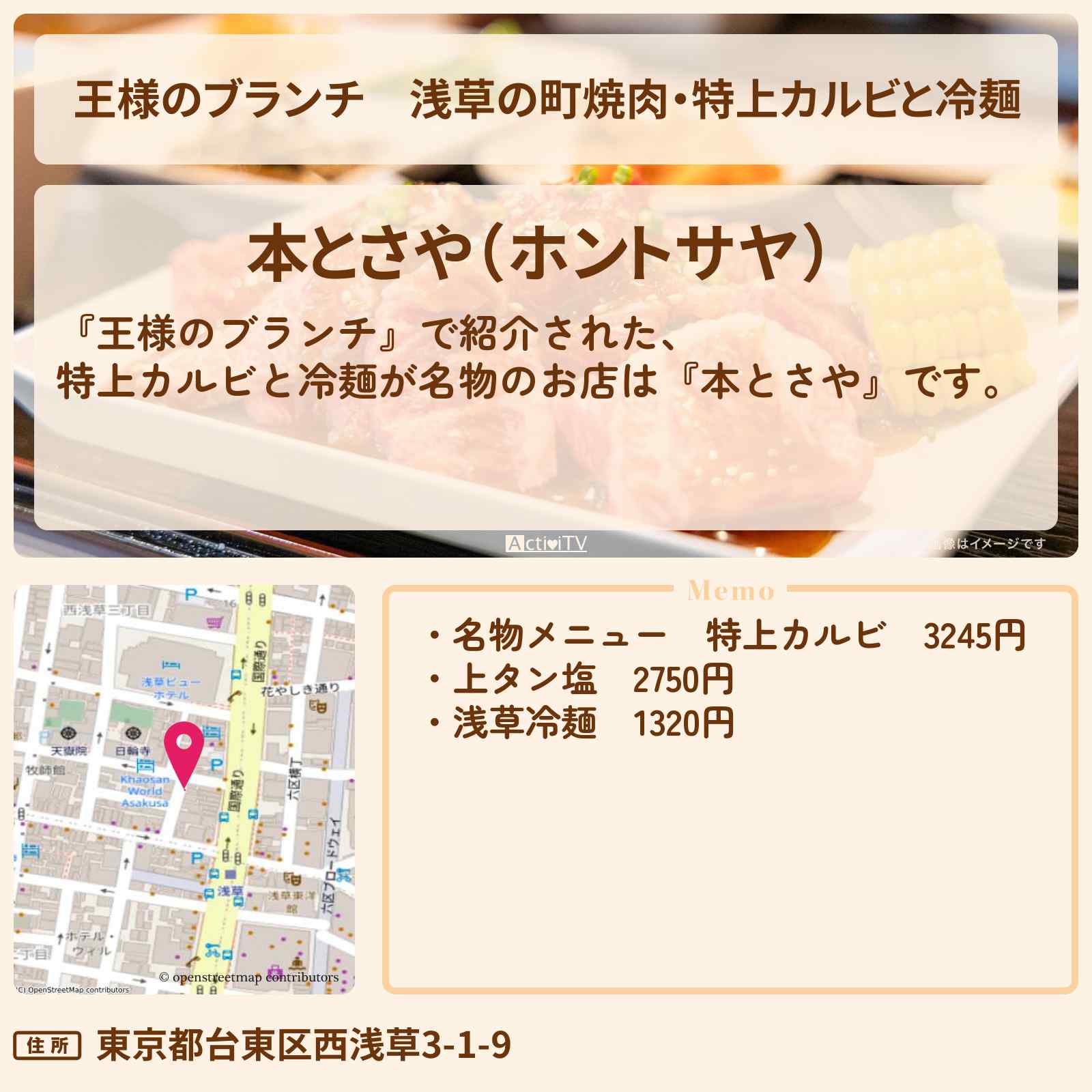 【王様のブランチ】浅草の町焼肉・特上カルビと冷麺『本とさや』のお店の場所