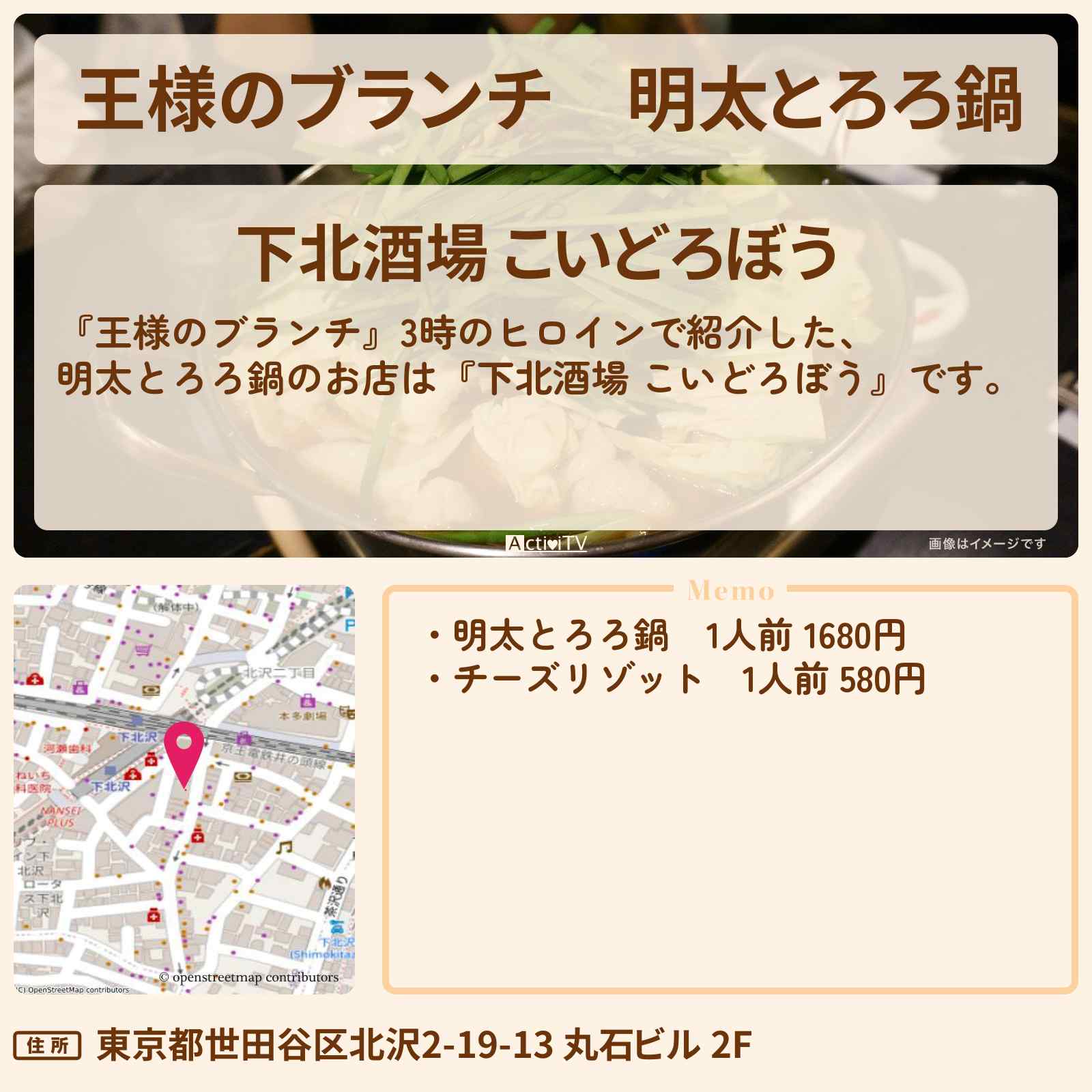 放送の【王様のブランチ】3時のヒロインで紹介した、明太とろろ鍋のお店は『下北酒場 こいどろぼう』です。