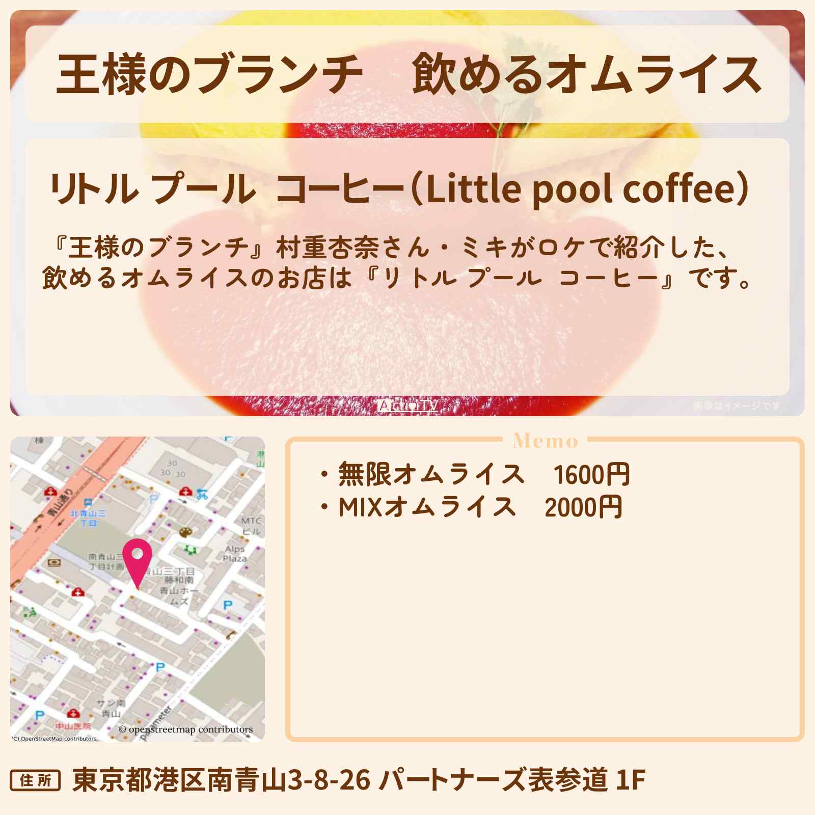 放送の【王様のブランチ】村重杏奈さん・ミキがロケで紹介した、飲めるオムライスのお店は『リトル プール コーヒー』です。