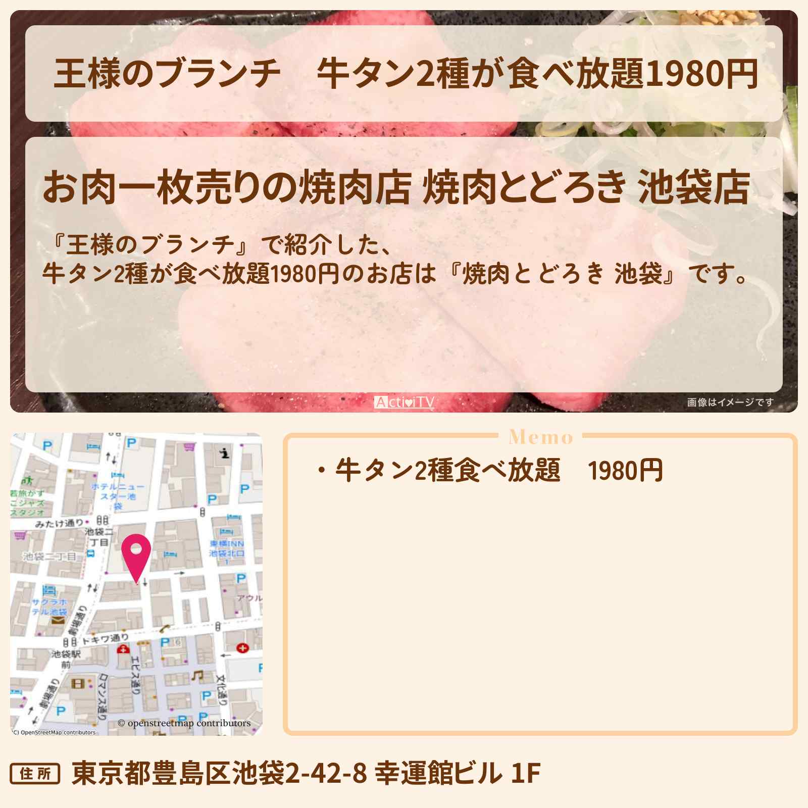 【王様のブランチ】牛タン2種が食べ放題1980円『焼肉とどろき 池袋』のお店の場所〔ごはんクラブ〕
