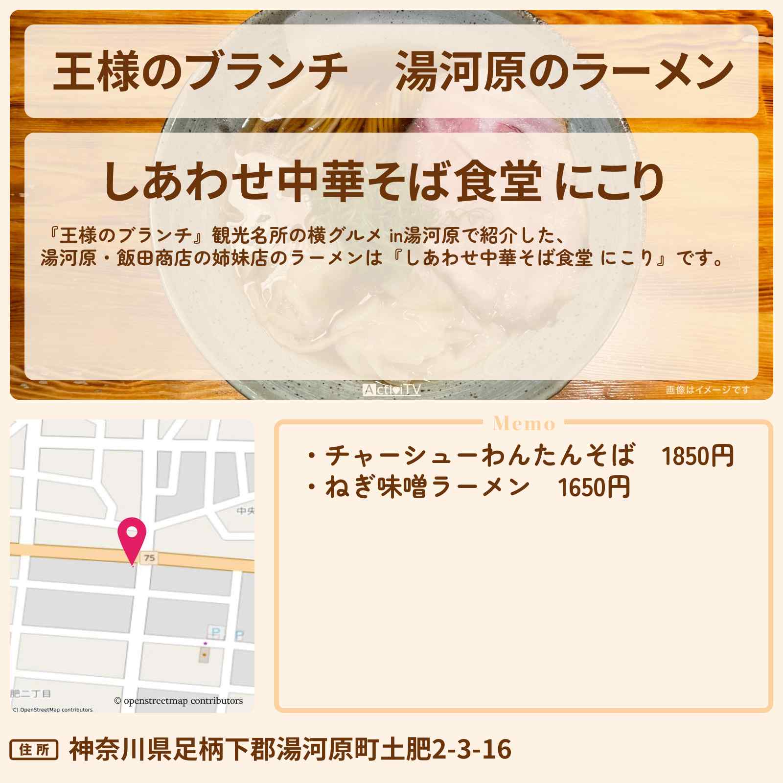放送の【王様のブランチ】観光名所の横グルメ in湯河原で紹介した、湯河原・飯田商店の姉妹店のラーメンは『しあわせ中華そば食堂 にこり』です。
