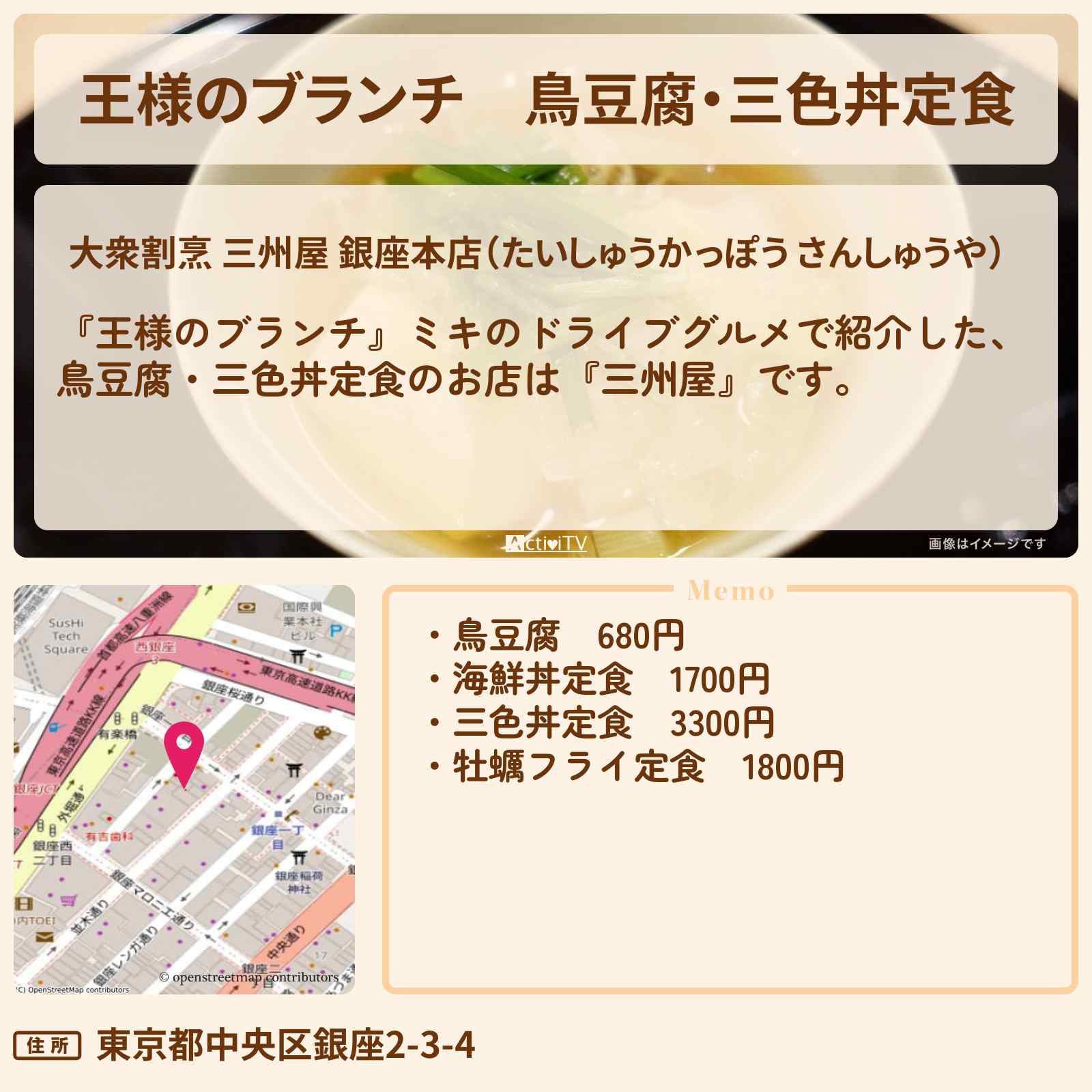 放送の【王様のブランチ】ミキのドライブグルメで紹介した、鳥豆腐・三色丼定食のお店は『三州屋』です。