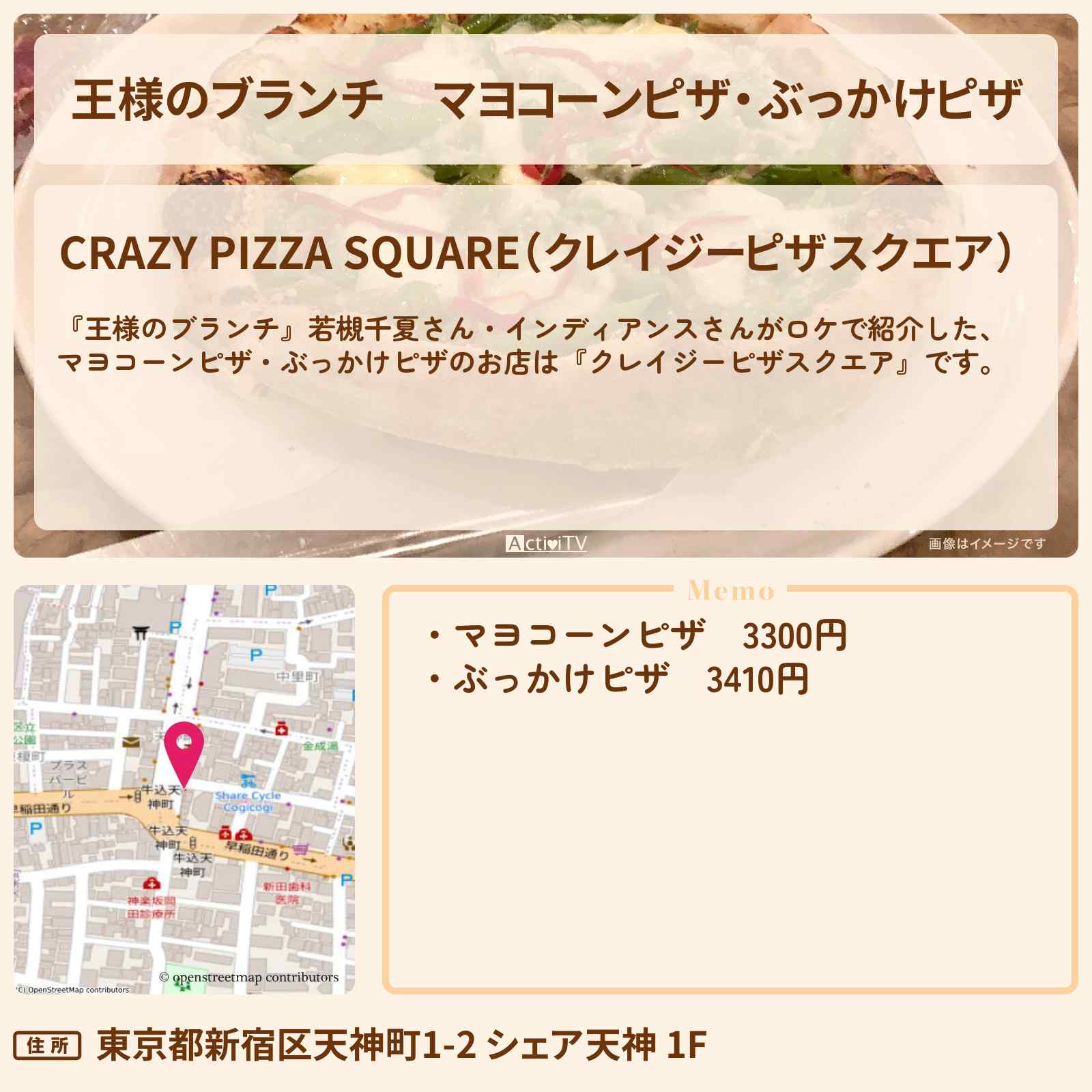 放送の【王様のブランチ】若槻千夏さん・インディアンスさんがロケで紹介した、マヨコーンピザ・ぶっかけピザのお店は『クレイジーピザスクエア』です。