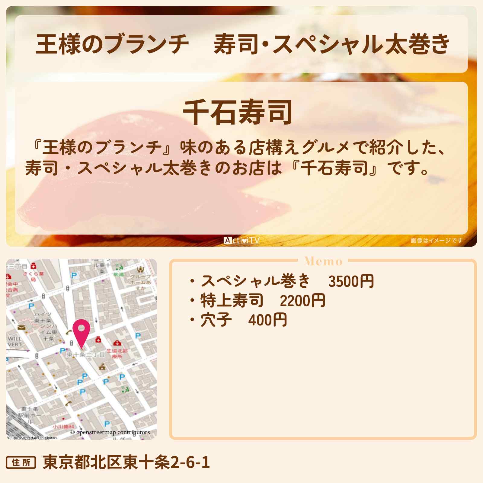放送の【王様のブランチ】味のある店構えグルメで紹介した、寿司・スペシャル太巻きのお店は『千石寿司』です。