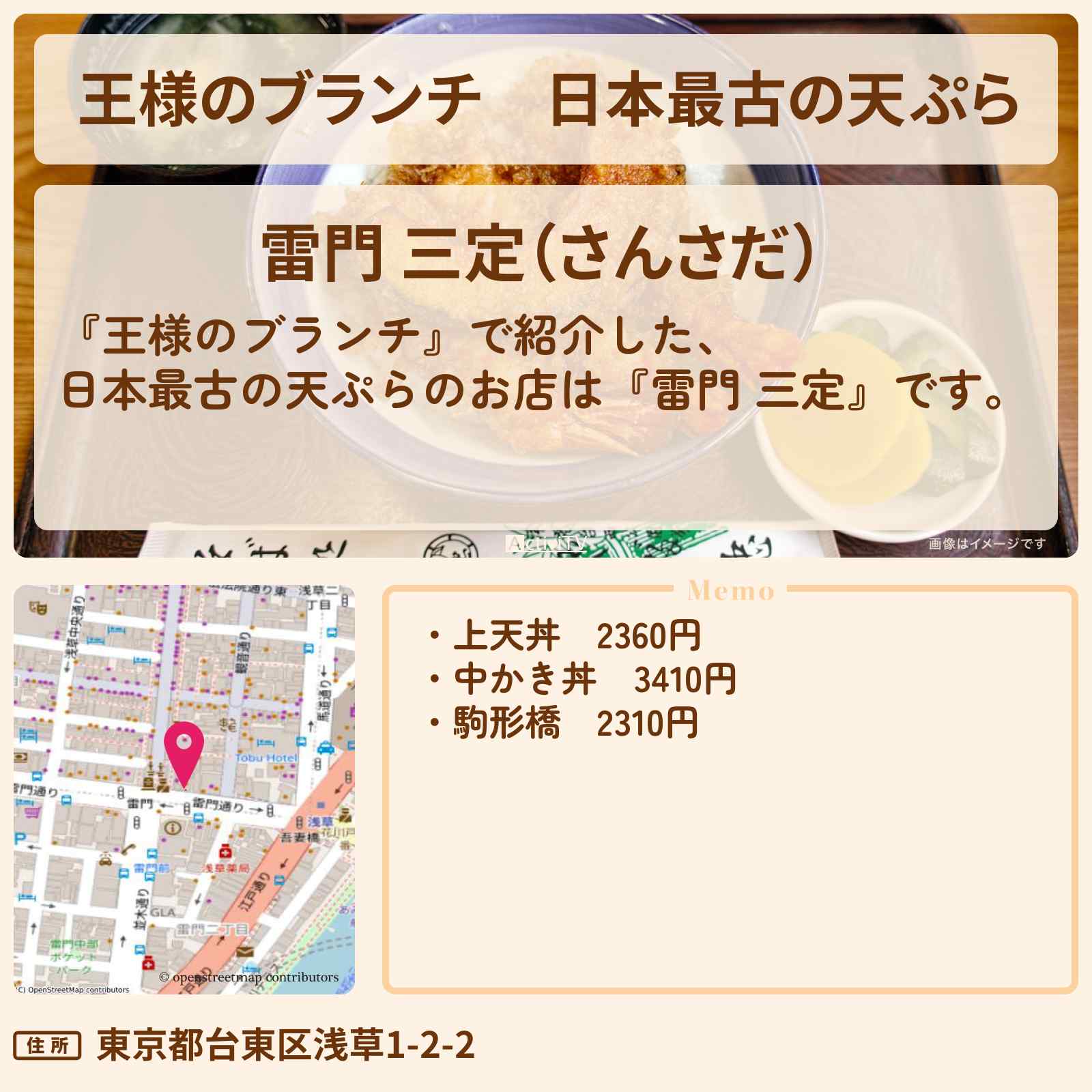 日本最古の天ぷら老舗、浅草雷門となり、三定(さんさだ)は、胡麻油で揚げた江戸前の天ぷら、かき揚げが名物です。浅草観光、スカイツリー見学の際は、ぜひお食事にお立ち寄りください。…
