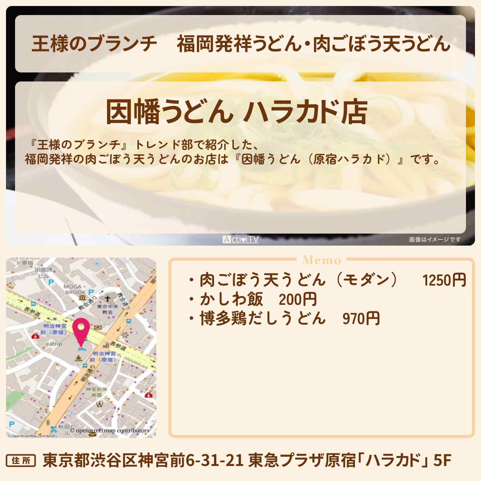 放送の【王様のブランチ】トレンド部で紹介した、福岡発祥の肉ごぼう天うどんのお店は『因幡うどん(原宿ハラカド)』です。