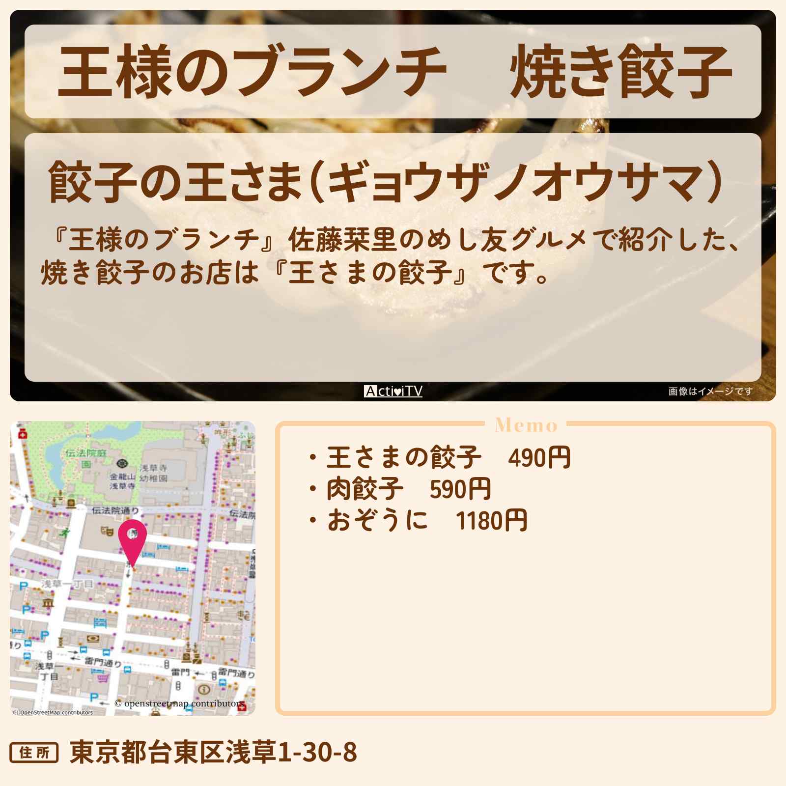 浅草エリアの1954年創業の老舗、餃子の王さまのオフィシャルページです。お店の基本情報やメニュー情報などをご紹介しています。