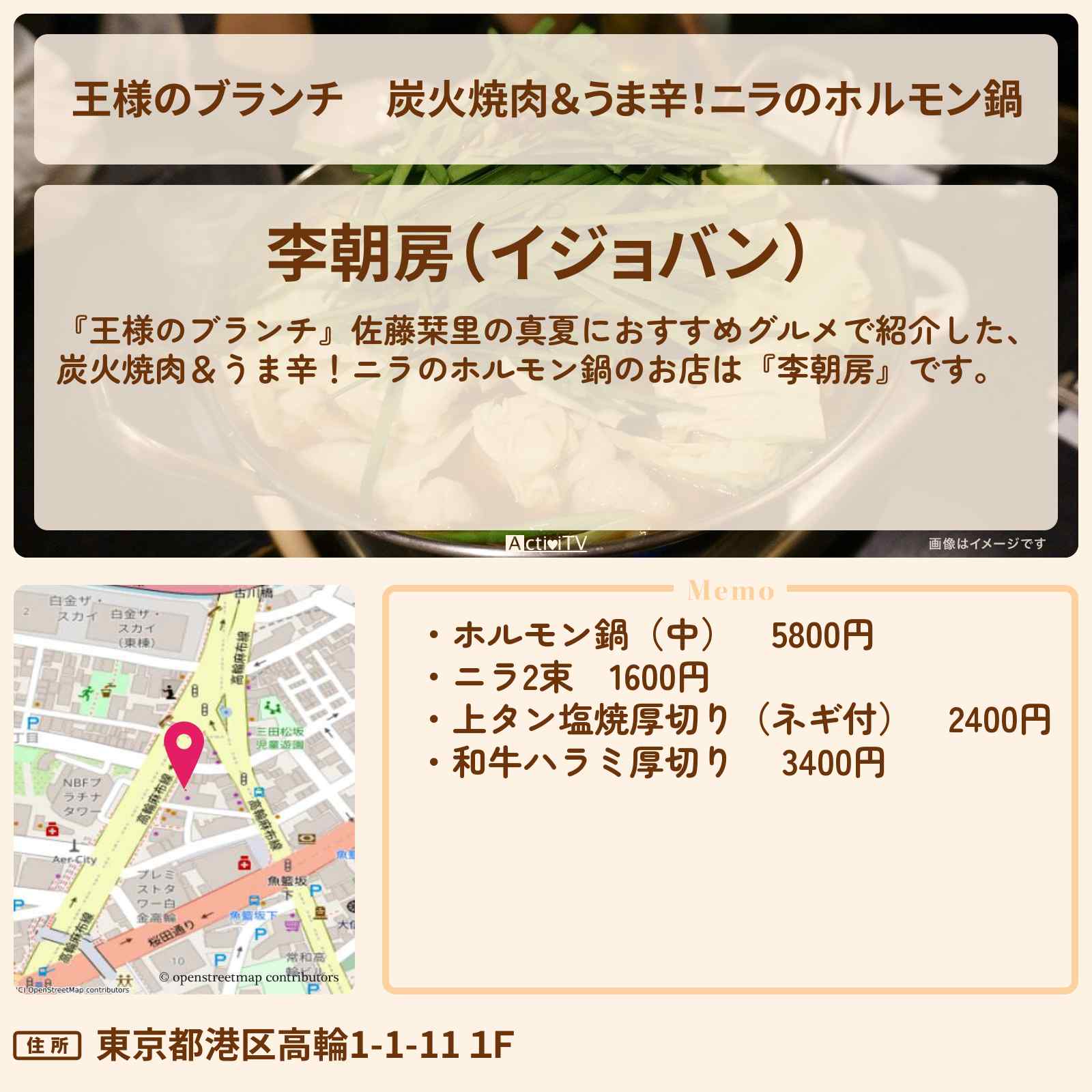 【王様のブランチ】炭火焼肉&うま辛!ニラのホルモン鍋『李朝房』白金高輪の焼肉のお店の場所〔佐藤栞里〕