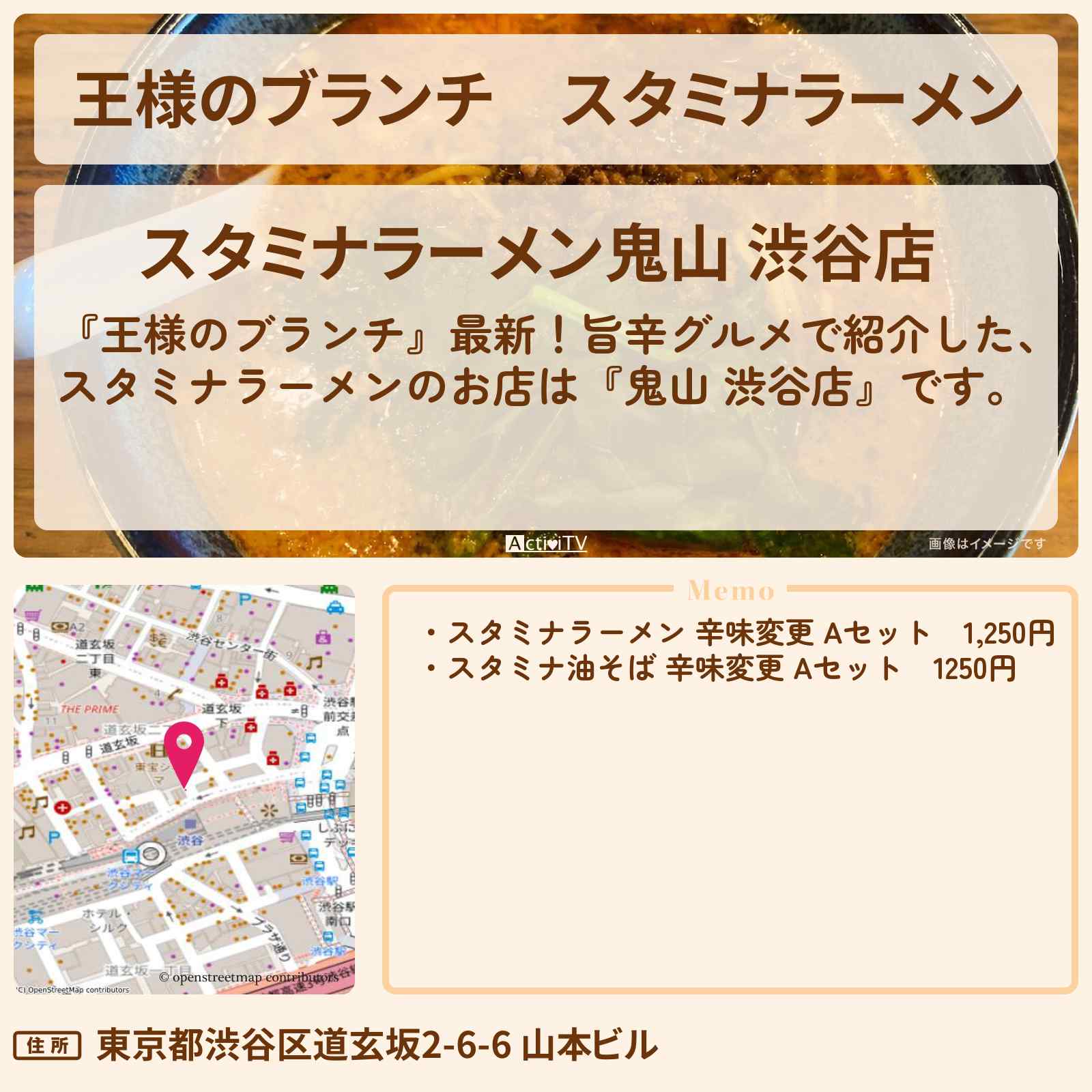 【王様のブランチ】スタミナラーメン『鬼山 渋谷店』のお店の場所〔ごはんクラブ・旨辛グルメ〕