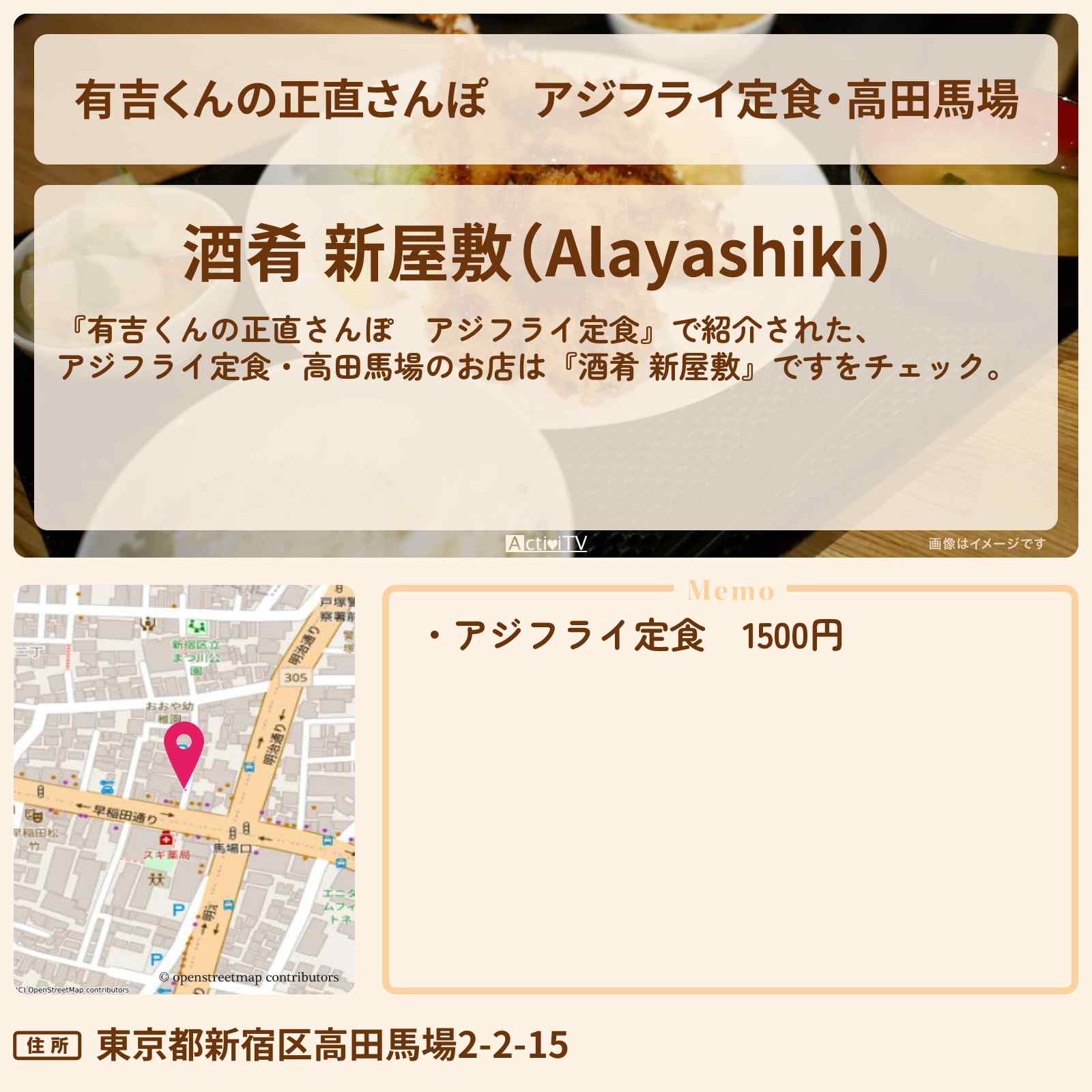 2022年7月9日放送の【有吉くんの正直さんぽ アジフライ定食】で紹介された、アジフライ定食・高田馬場のお店は『酒肴 新屋敷』ですをチェック。