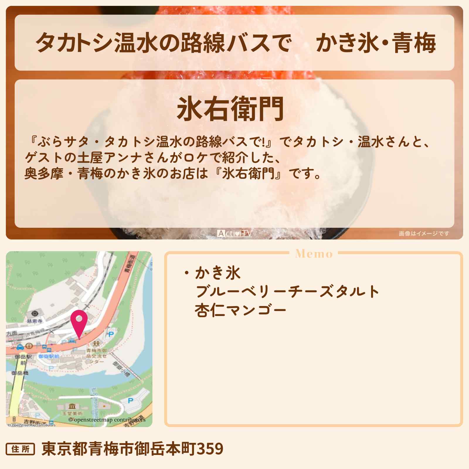 放送の【ぶらサタ・タカトシ温水の路線バスで!】でタカトシ・温水さんと、ゲストの土屋アンナさんがロケで紹介した、奥多摩・青梅のかき氷のお店は『氷右衛門』です。