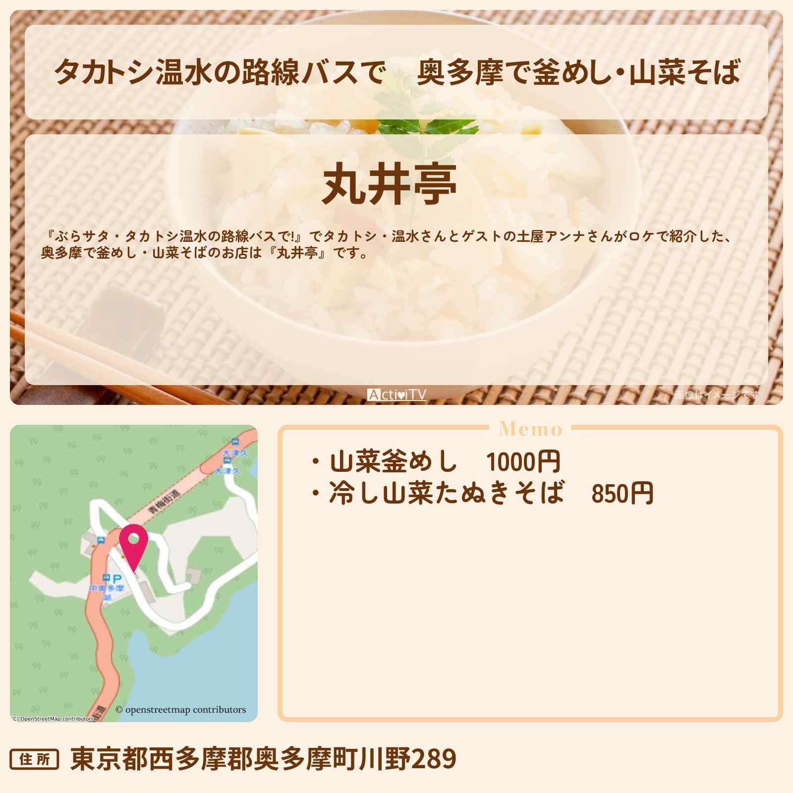 放送の【ぶらサタ・タカトシ温水の路線バスで!】でタカトシ・温水さんとゲストの土屋アンナさんがロケで紹介した、奥多摩で釜めし・山菜そばのお店は『丸井亭』です。
