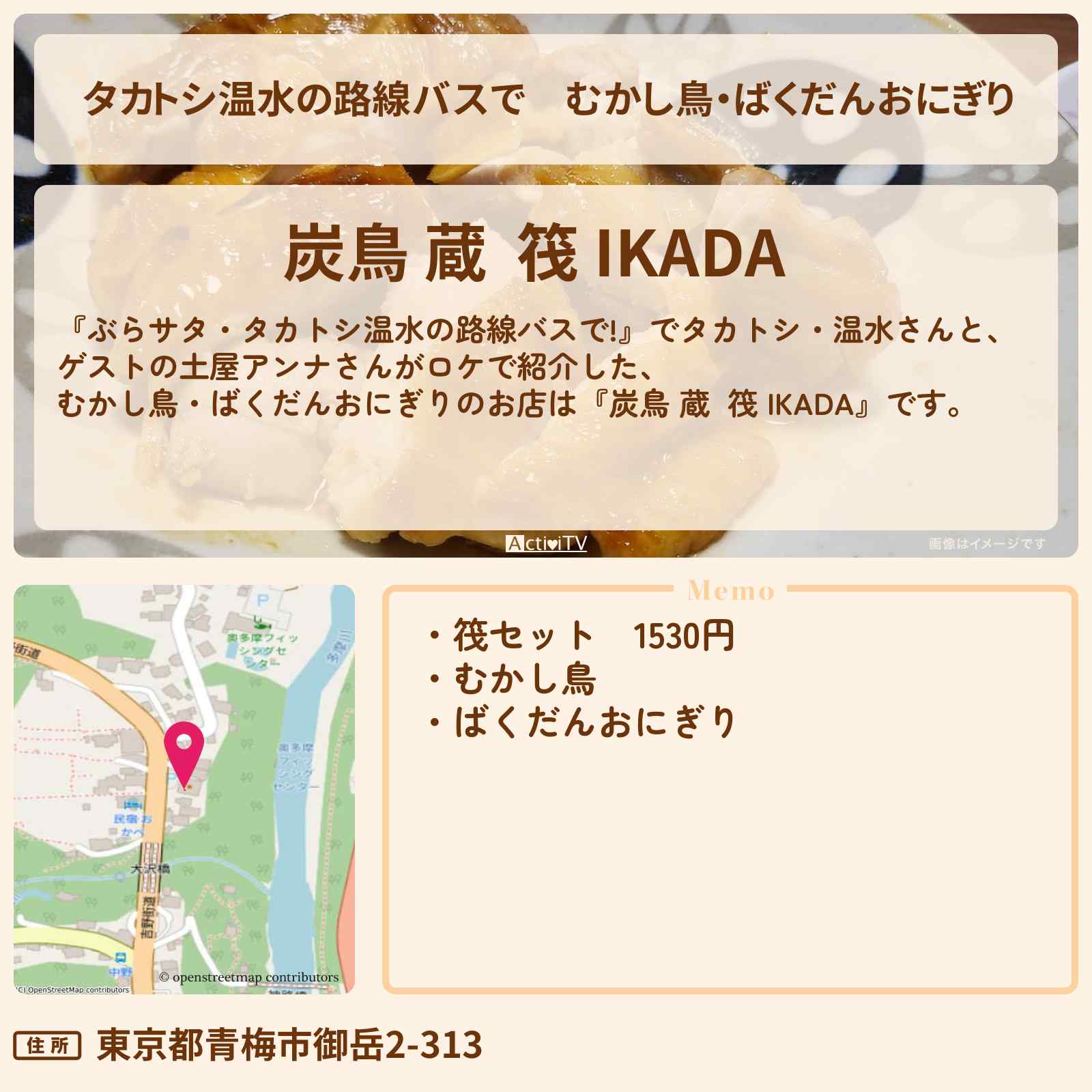 放送の【ぶらサタ・タカトシ温水の路線バスで!】でタカトシ・温水さんと、ゲストの土屋アンナさんがロケで紹介した、むかし鳥・ばくだんおにぎりのお店は『炭鳥 蔵 筏 IKADA』です。