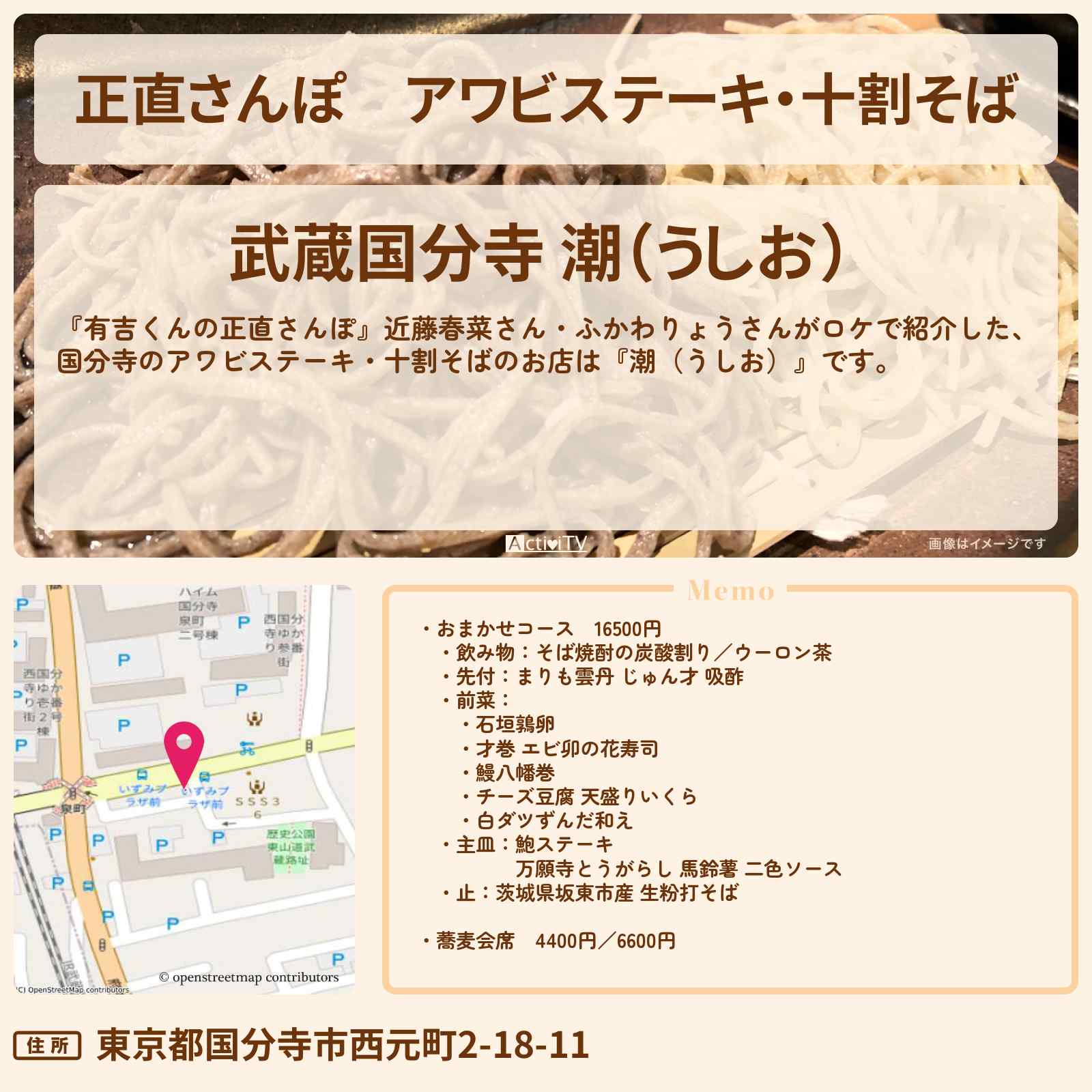 放送の【有吉くんの正直さんぽ】近藤春菜さん・ふかわりょうさんがロケで紹介した、国分寺のアワビステーキ・十割そばのお店は『潮(うしお)』です。