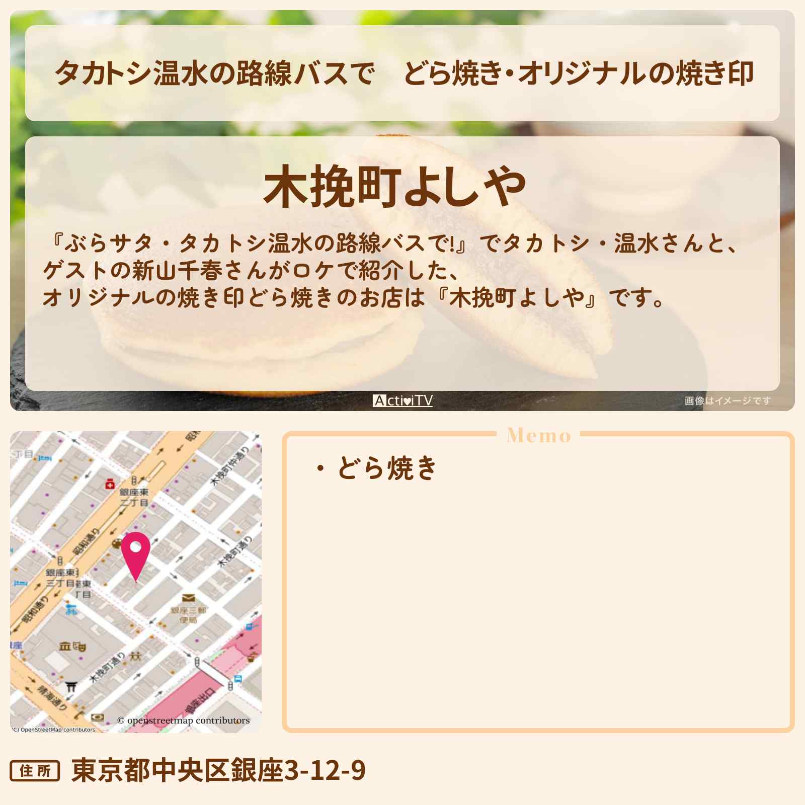放送の【ぶらサタ・タカトシ温水の路線バスで!】でタカトシ・温水さんと、ゲストの新山千春さんがロケで紹介した、オリジナルの焼き印どら焼きのお店は『木挽町よしや』です。