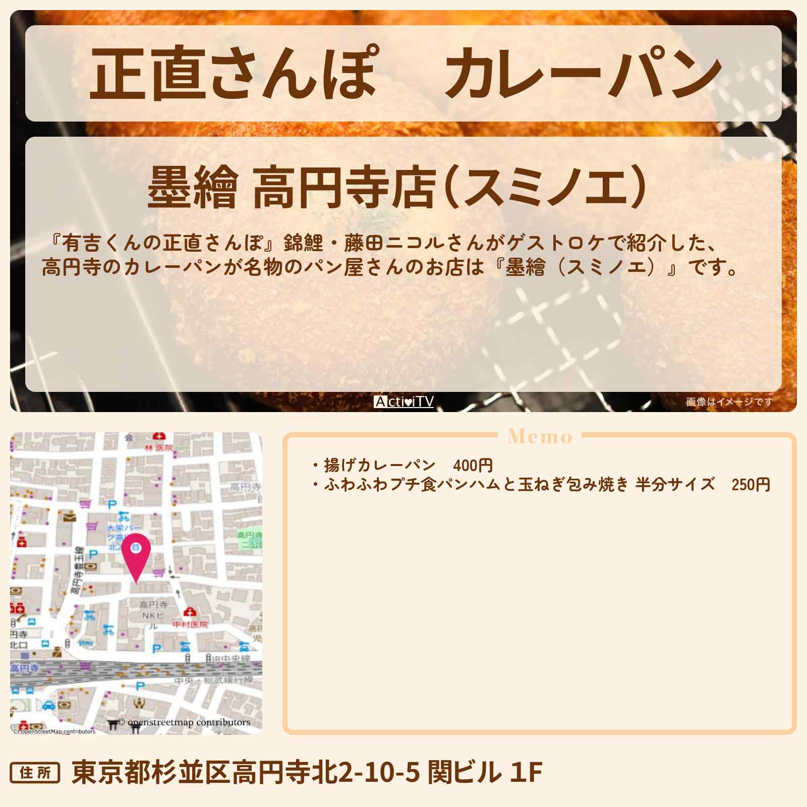 放送の【有吉くんの正直さんぽ】錦鯉・藤田ニコルさんがゲストロケで紹介した、高円寺のカレーパンが名物のパン屋さんのお店は『墨繪(スミノエ)』です。