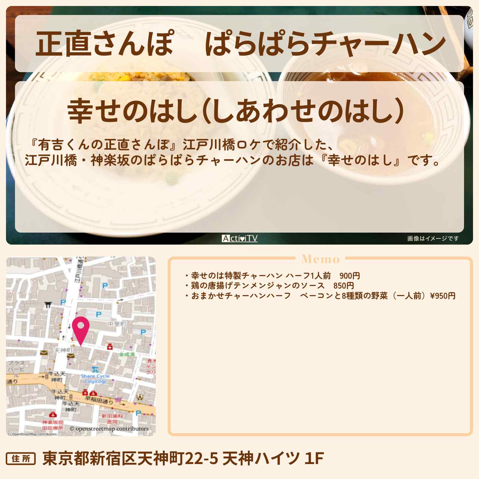 放送の【有吉くんの正直さんぽ】江戸川橋ロケで紹介した、江戸川橋・神楽坂のぱらぱらチャーハンのお店は『幸せのはし』です。