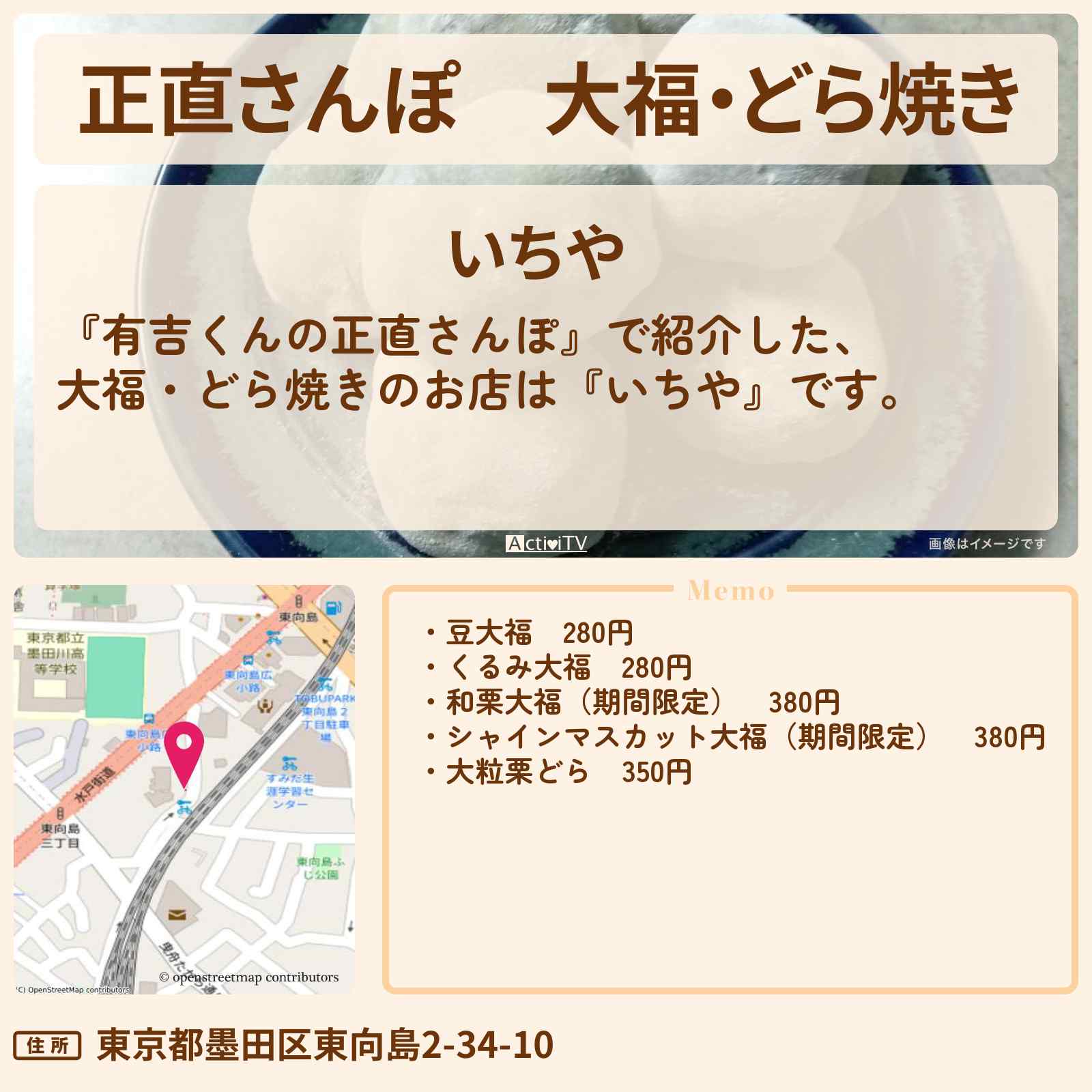 放送の【有吉くんの正直さんぽ】で紹介した、大福・どら焼きのお店は『いちや』です。