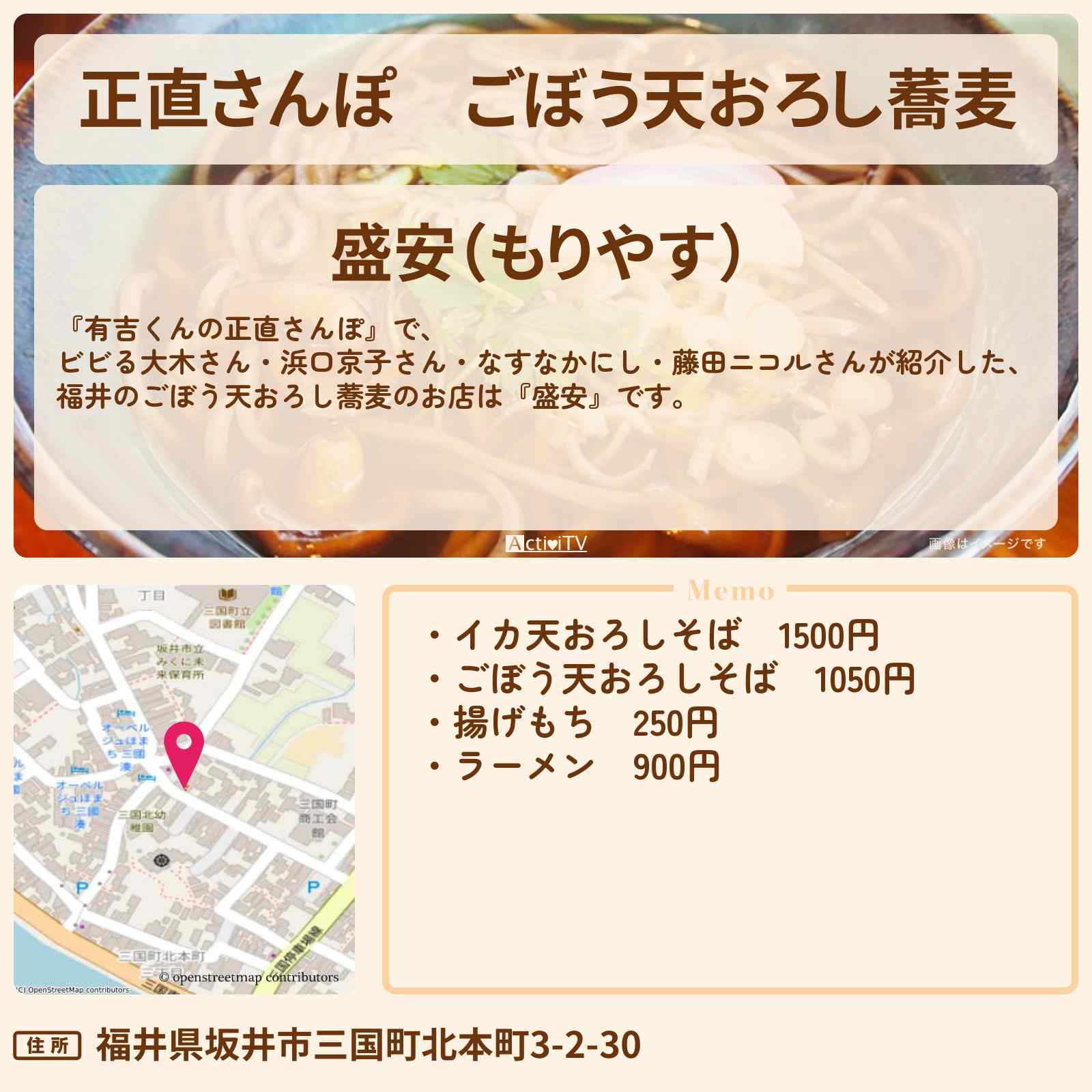 そば処盛安(坂井/和食/うどん・そば)の店舗情報・予約なら、お得なクーポン満載【ホットペッパーグルメ】!そば処盛安のおすすめポイントは、平日なら、作り立て・打ち立ての麺と こだわりのつゆをリーズナブルに楽しめるお得なランチもある。 歴史あるお店の暖簾をくぐればスタッフが温かく迎えてくれる。一人でも気軽に立ち寄って食事が楽しめる。。そば処盛安の地図、メニュー、口コミ、写真などグルメ情報満載です!…