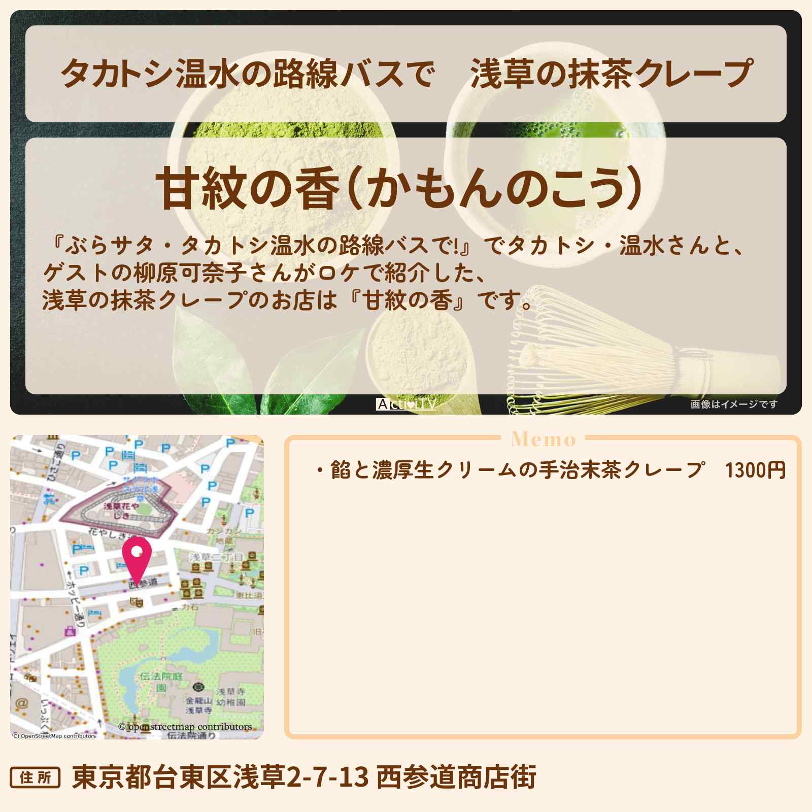五感で味わう至高の和クレープ。甘紋の香 -かもんのこう-では、上質な素材を組み合わせ、味のバランス、香りや風味を最大限引き出す組み合わせを意識し、飽きのこない食感や味の変化を構造的にを計算して作り上げたクレープをご提供いたします。…